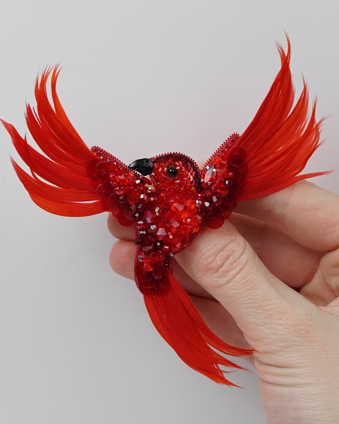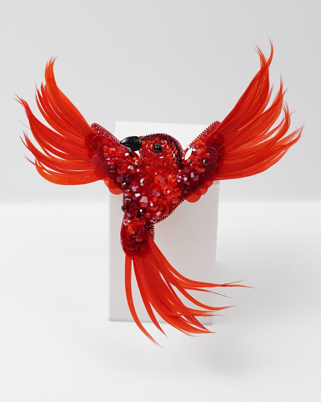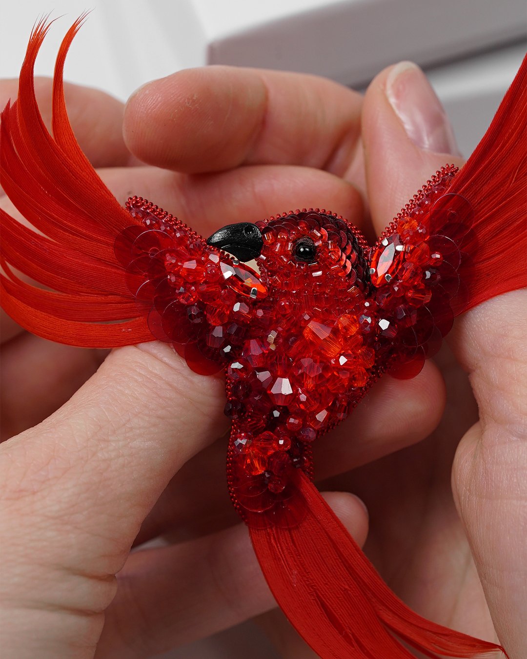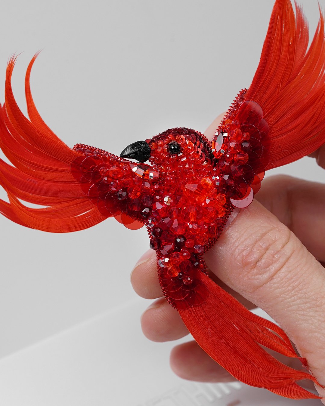 Transform your outfit with this stunning handcrafted red bird brooch, a true masterpiece of artisanal jewelry making. The vibrant piece features natural red feathers that create dramatic wing and tail effects, perfectly complementing the exquisitely beaded body. The bird’s form is meticulously adorned with an array of premium materials including sparkling rhinestones, Swarovski crystal beads, and a mix of faceted glass beads. Japanese and Czech seed beads add intricate detail, while carefully placed sequins catch and reflect light with every movement. Each component is thoughtfully arranged to create a dynamic, three-dimensional effect that brings this avian artwork to life. The pin’s striking appearance makes it an ideal statement piece for special occasions, adding a touch of dramatic elegance to jackets, shawls, or hats. The brooch serves as both a practical accessory and a conversation-starting piece of wearable art.