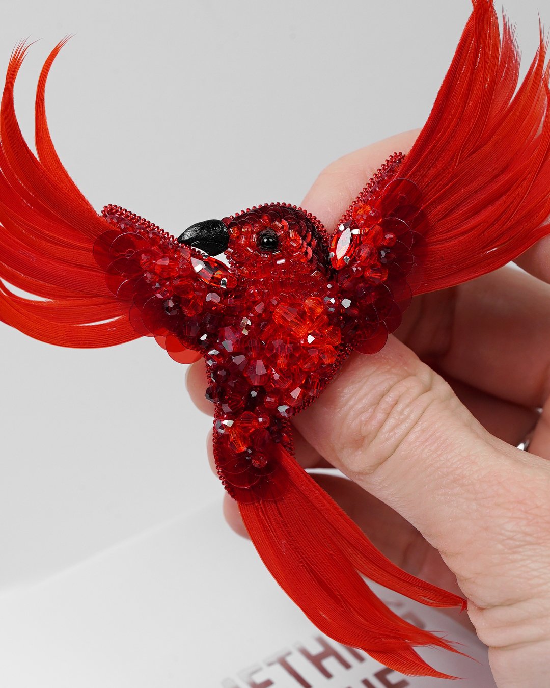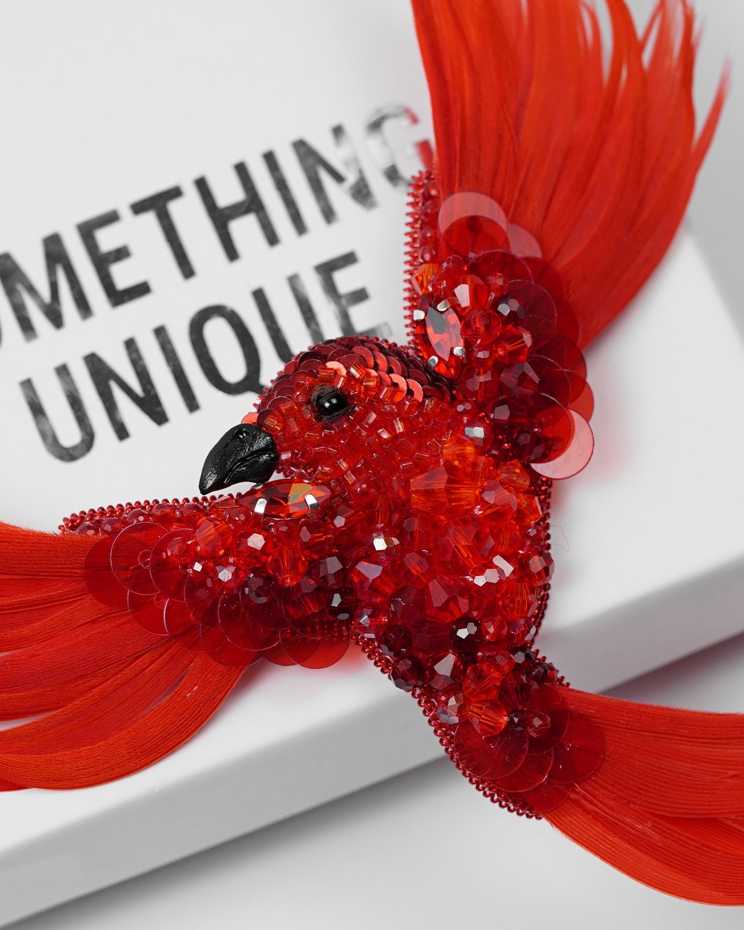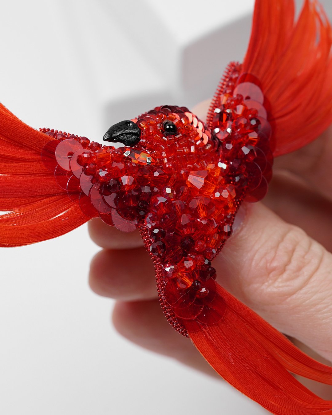 Transform your outfit with this stunning handcrafted red bird brooch, a true masterpiece of artisanal jewelry making. The vibrant piece features natural red feathers that create dramatic wing and tail effects, perfectly complementing the exquisitely beaded body. The bird’s form is meticulously adorned with an array of premium materials including sparkling rhinestones, Swarovski crystal beads, and a mix of faceted glass beads. Japanese and Czech seed beads add intricate detail, while carefully placed sequins catch and reflect light with every movement. Each component is thoughtfully arranged to create a dynamic, three-dimensional effect that brings this avian artwork to life. The pin’s striking appearance makes it an ideal statement piece for special occasions, adding a touch of dramatic elegance to jackets, shawls, or hats. The brooch serves as both a practical accessory and a conversation-starting piece of wearable art.