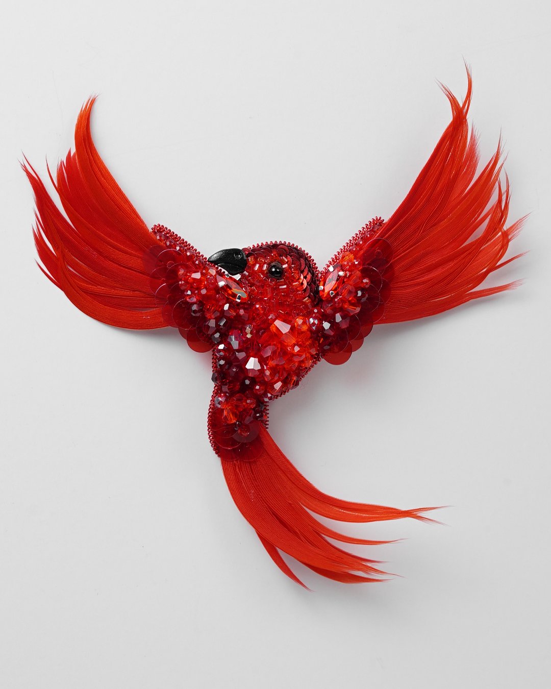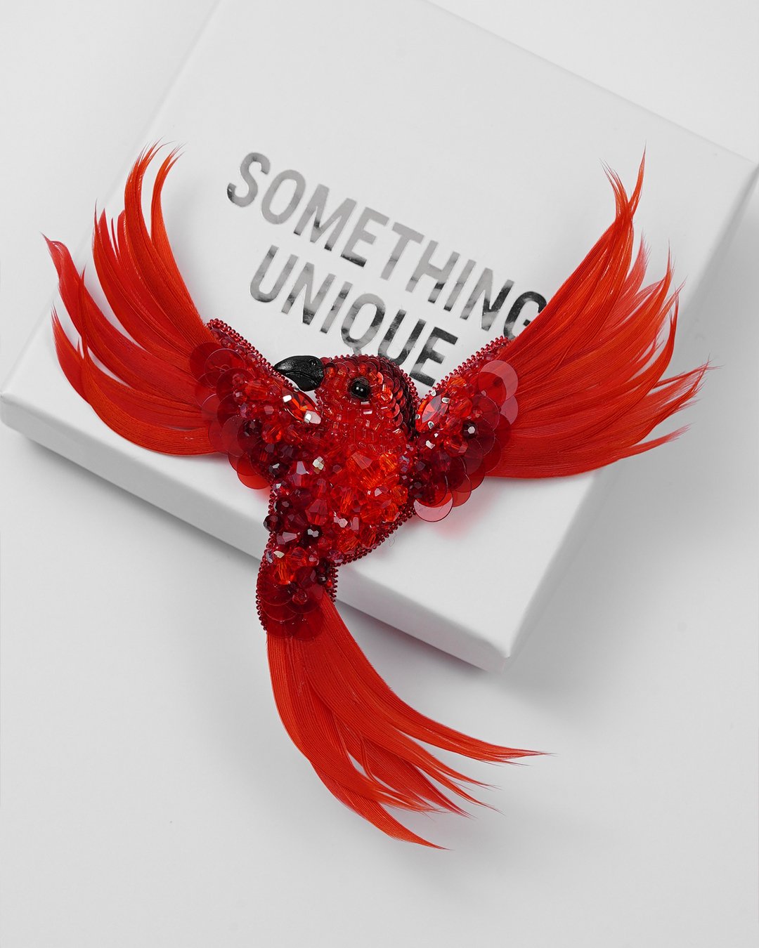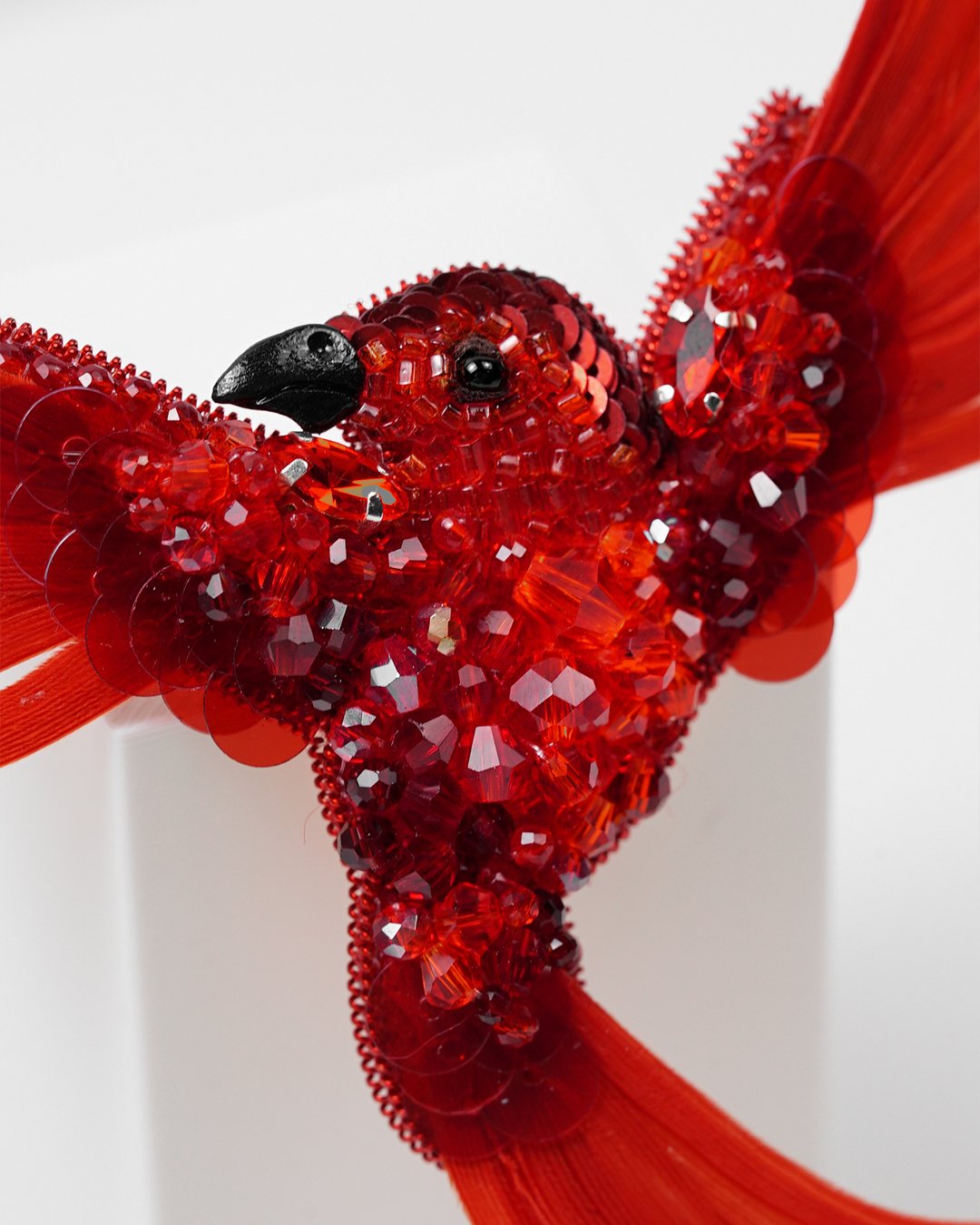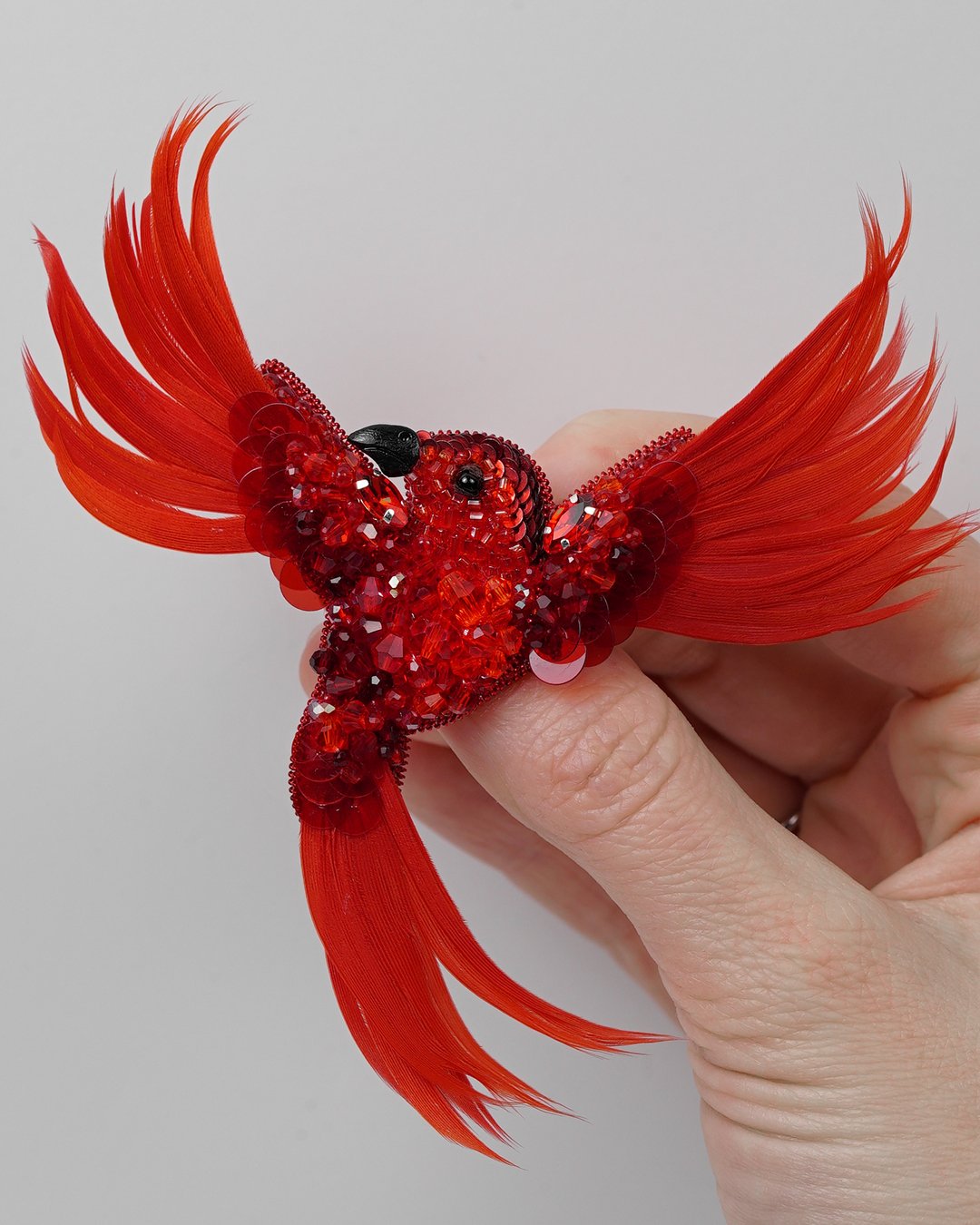Transform your outfit with this stunning handcrafted red bird brooch, a true masterpiece of artisanal jewelry making. The vibrant piece features natural red feathers that create dramatic wing and tail effects, perfectly complementing the exquisitely beaded body. The bird’s form is meticulously adorned with an array of premium materials including sparkling rhinestones, Swarovski crystal beads, and a mix of faceted glass beads. Japanese and Czech seed beads add intricate detail, while carefully placed sequins catch and reflect light with every movement. Each component is thoughtfully arranged to create a dynamic, three-dimensional effect that brings this avian artwork to life. The pin’s striking appearance makes it an ideal statement piece for special occasions, adding a touch of dramatic elegance to jackets, shawls, or hats. The brooch serves as both a practical accessory and a conversation-starting piece of wearable art.