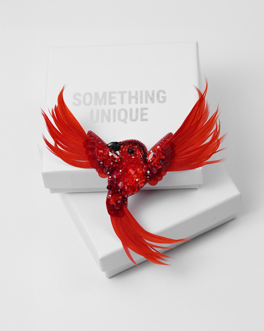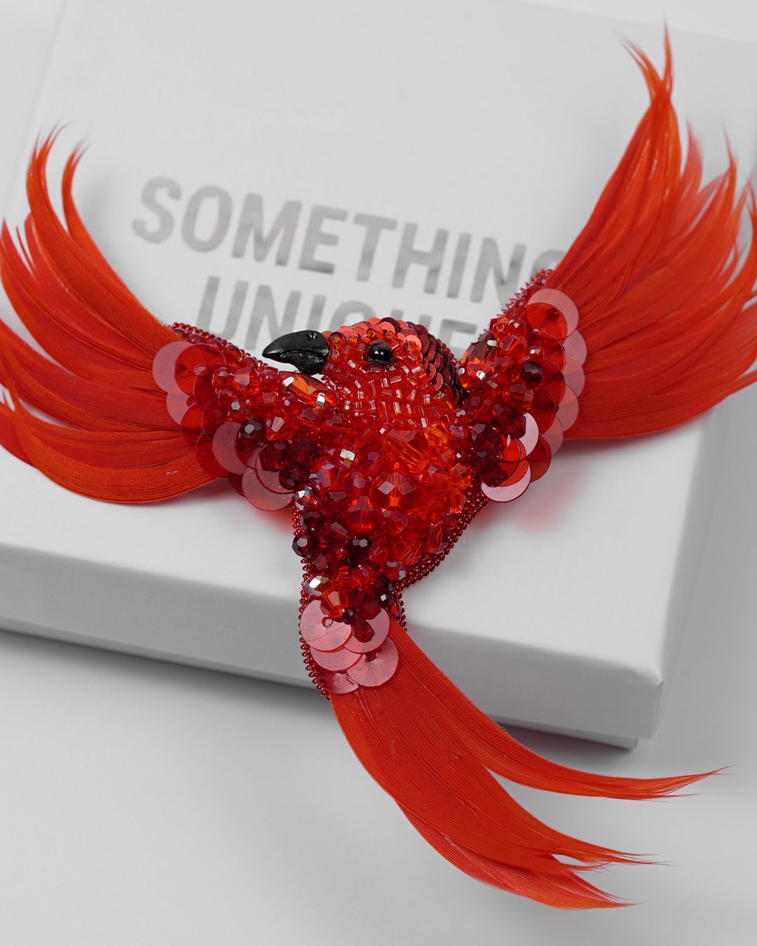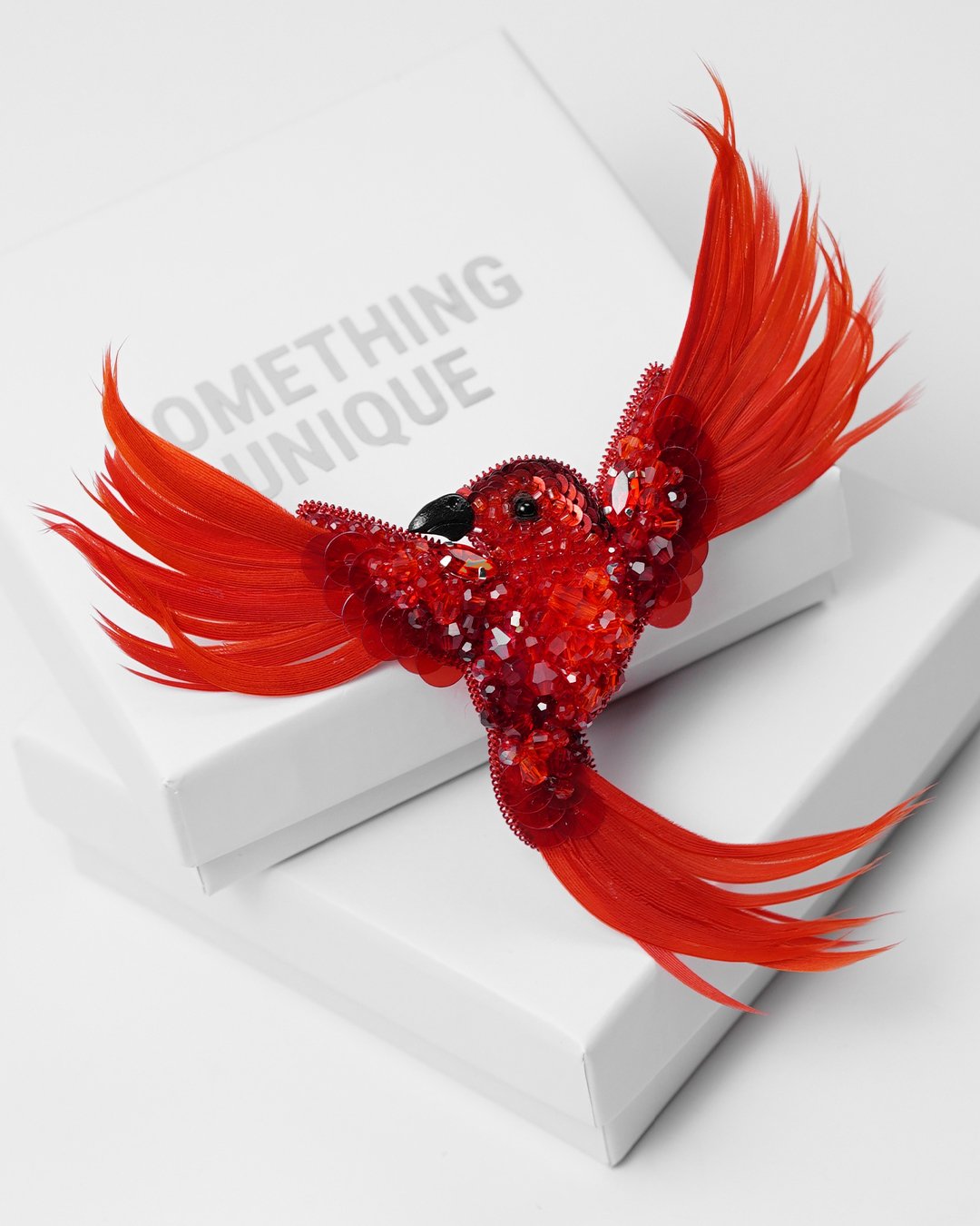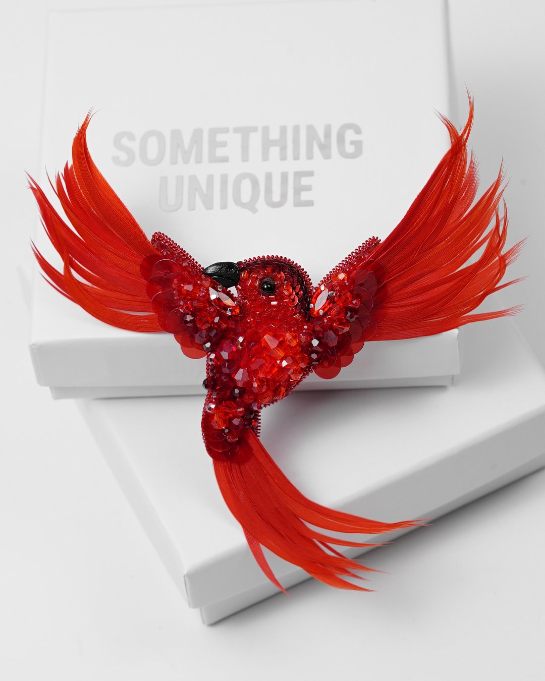 HANDCRAFTED DESIGN: Exquisitely detailed bird brooch featuring vibrant red natural feathers and premium crystal embellishments for a stunning statement piece