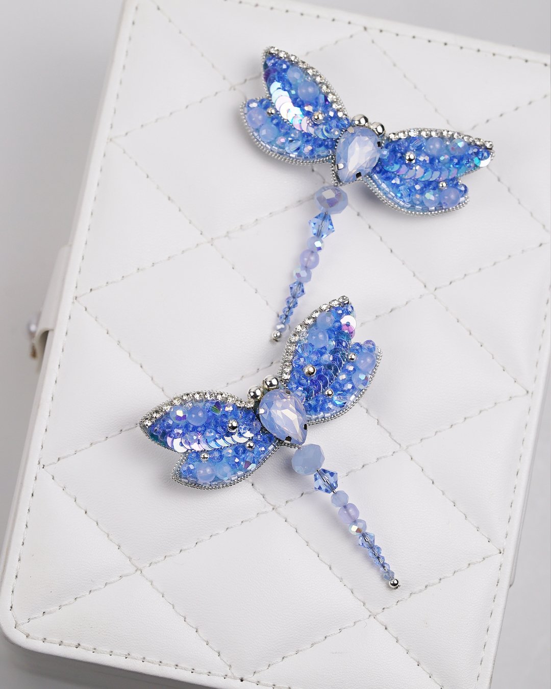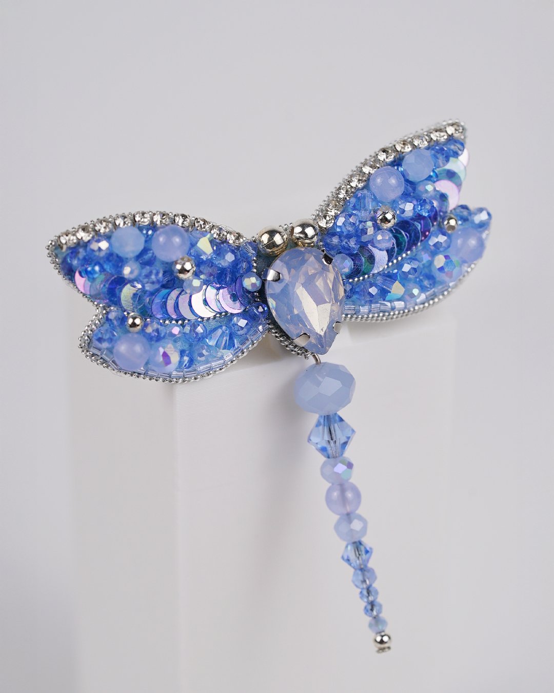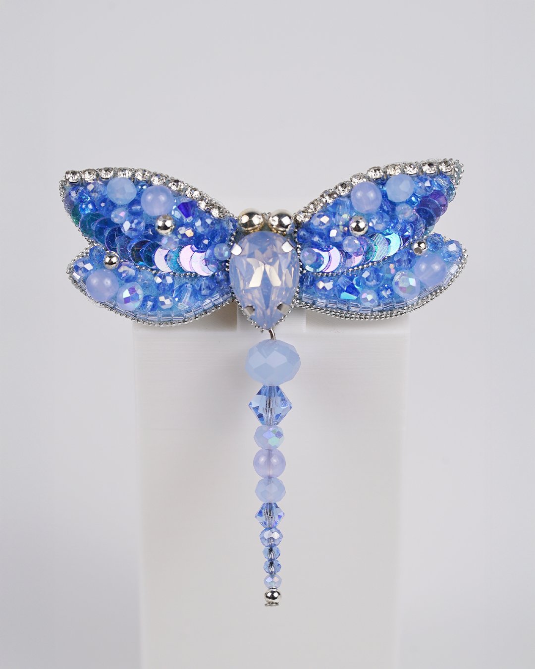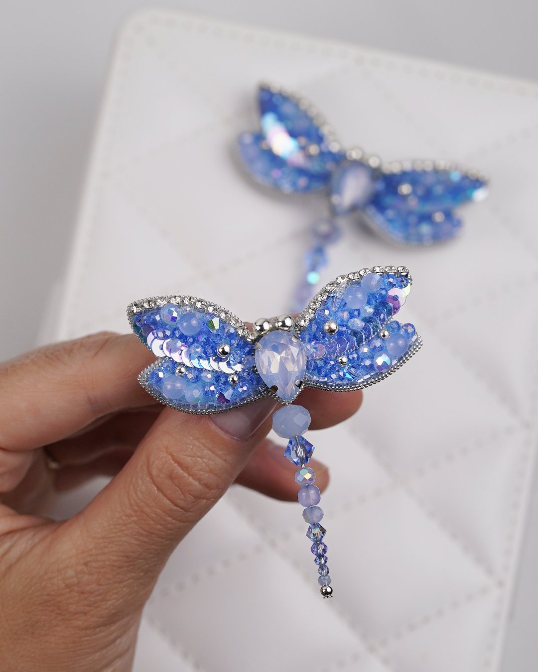 Bring a touch of ethereal charm to your outfit with our Sky Blue Dragonfly Beaded Brooch, a sparkling symbol of transformation and serenity. Carefully handcrafted using Swarovski crystal beads, premium glass beads, sequins, and Czech seed beads, this brooch shimmers in delicate gradients of sky blue and icy lilac. The intricate beadwork forms soft, glistening wings outlined in rhinestones, while the faceted teardrop crystal at the center adds a radiant focal point.