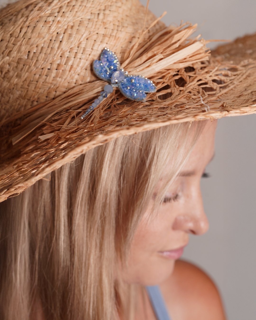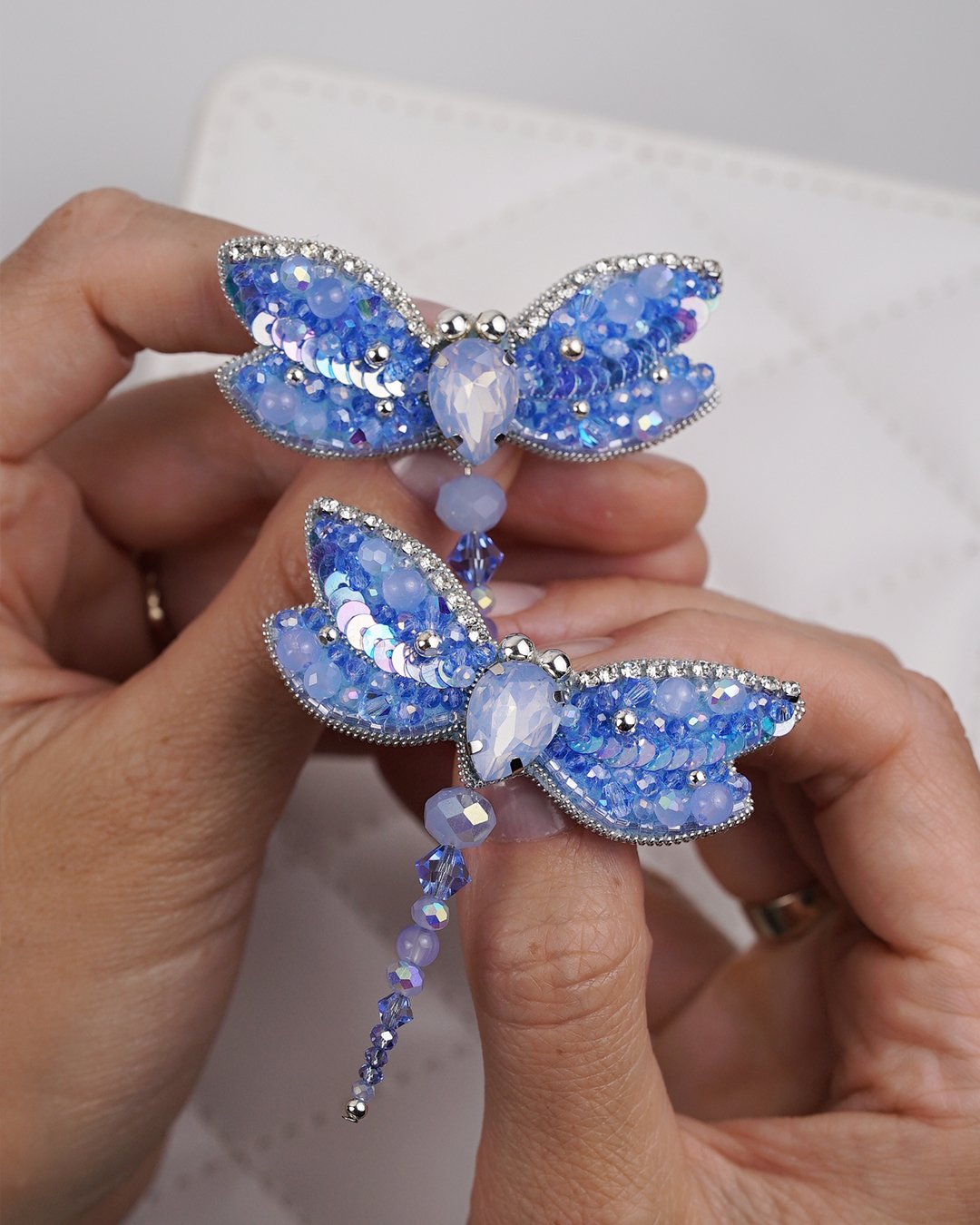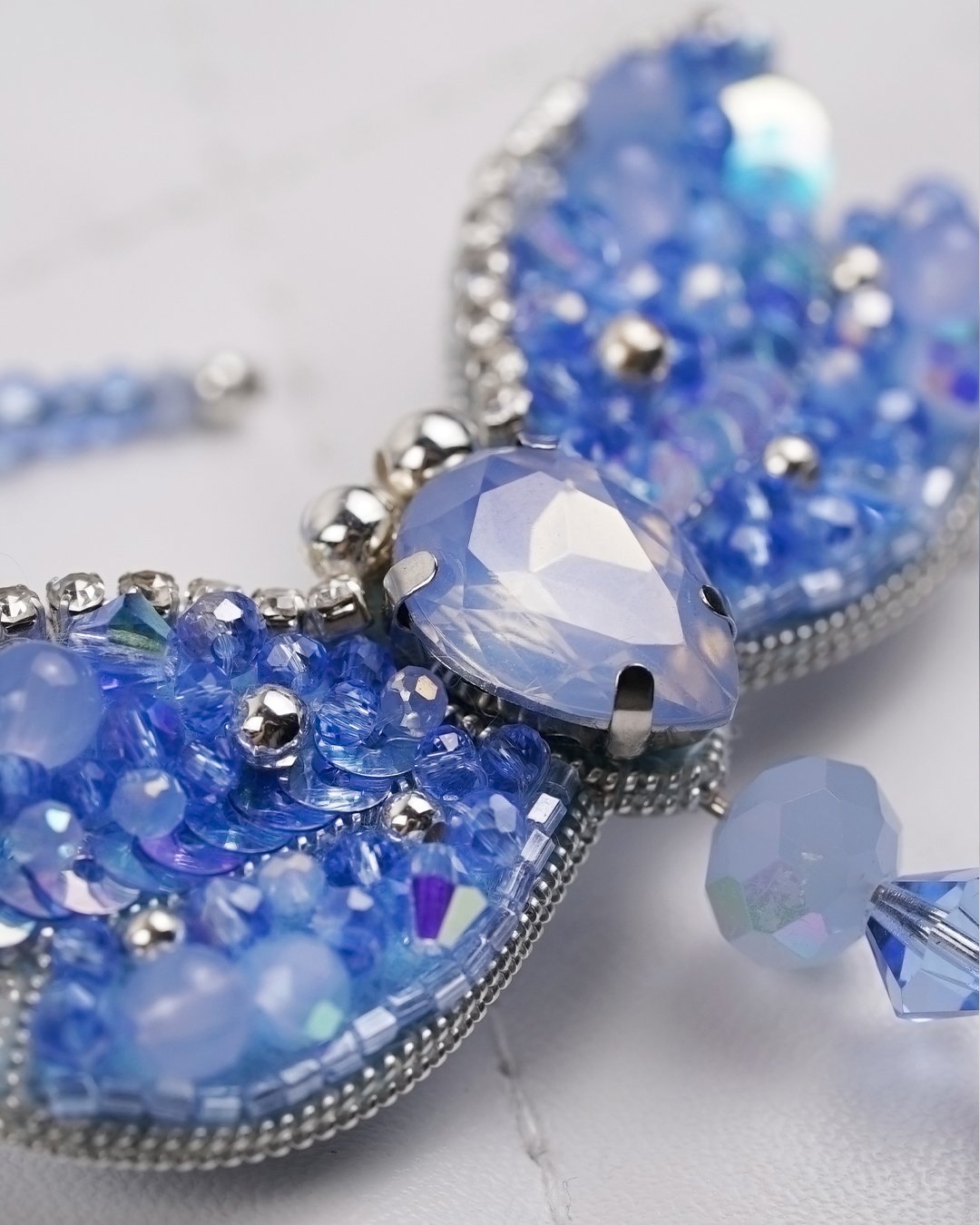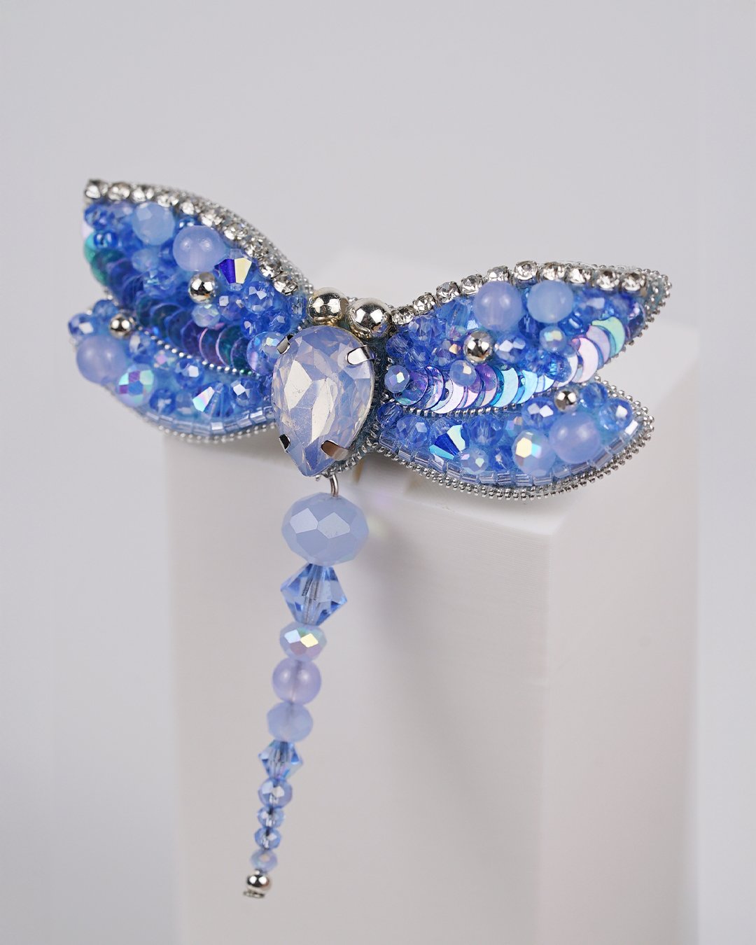 Bring a touch of ethereal charm to your outfit with our Sky Blue Dragonfly Beaded Brooch, a sparkling symbol of transformation and serenity. Carefully handcrafted using Swarovski crystal beads, premium glass beads, sequins, and Czech seed beads, this brooch shimmers in delicate gradients of sky blue and icy lilac. The intricate beadwork forms soft, glistening wings outlined in rhinestones, while the faceted teardrop crystal at the center adds a radiant focal point.