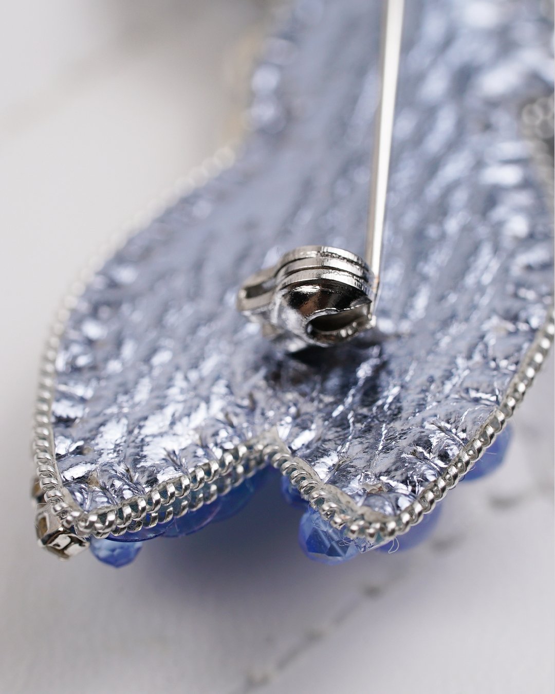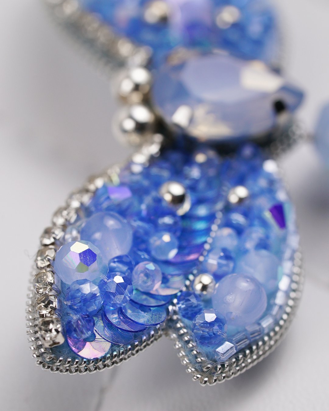 Handcrafted in dreamy shades of sky blue and lilac, this brooch glows with Swarovski crystals, rhinestones, and shimmering sequins. The dangling crystal tail adds just the right movement—and magic. 💙