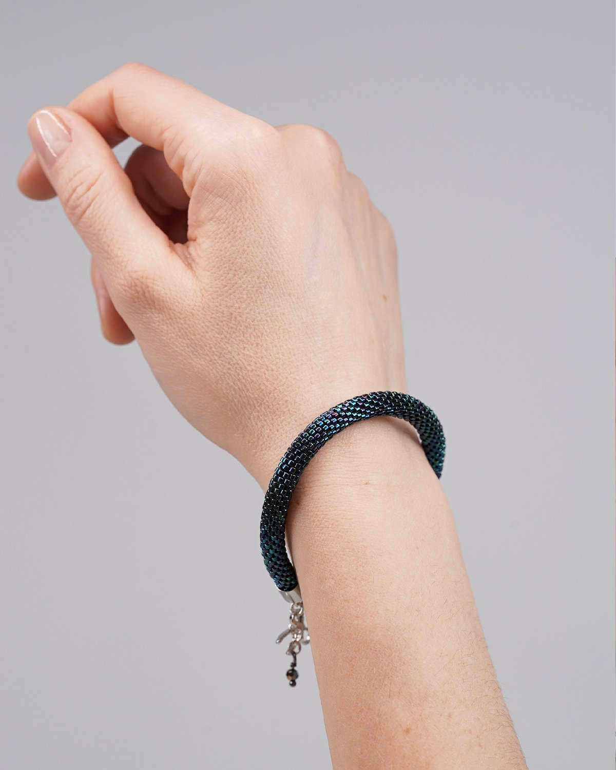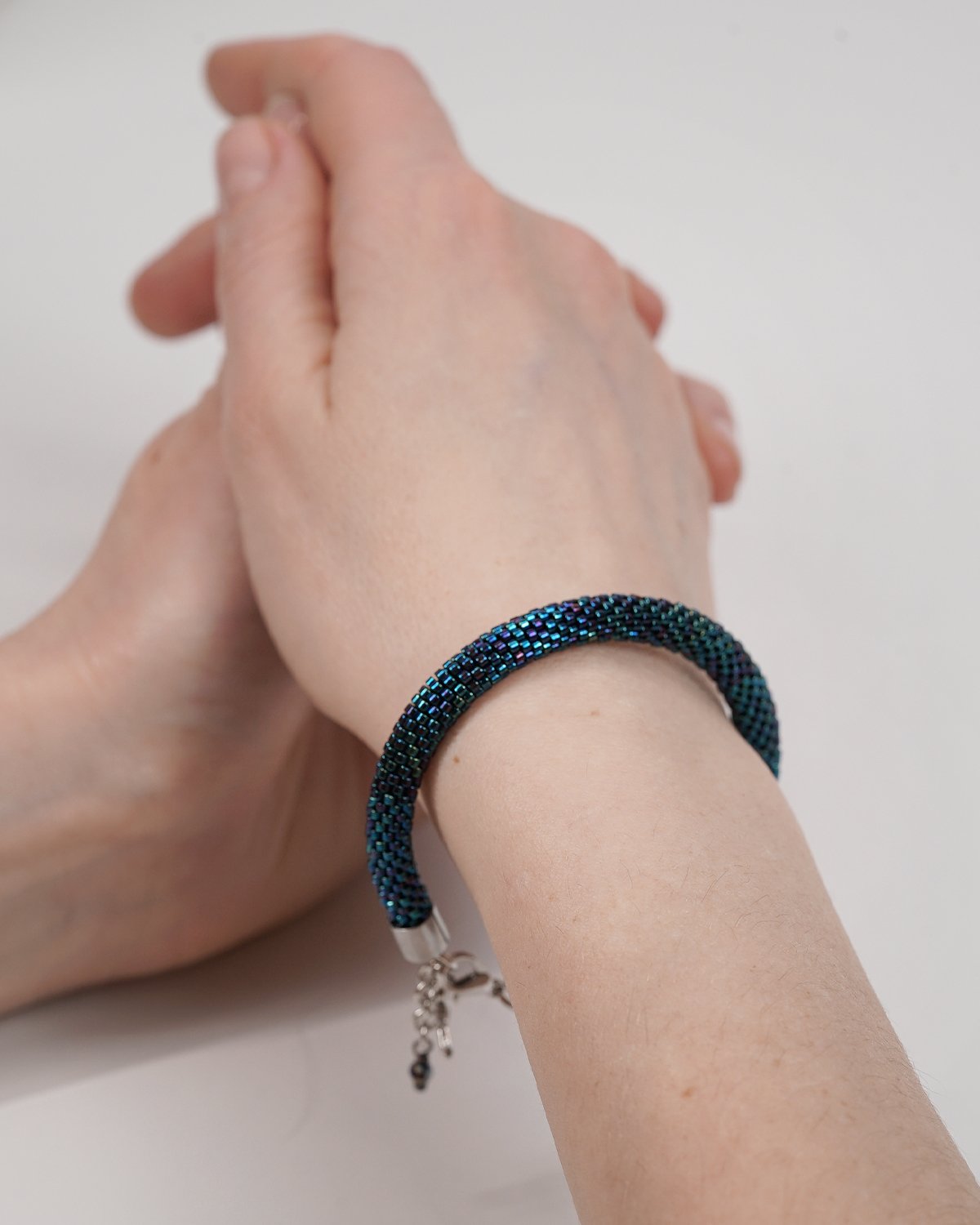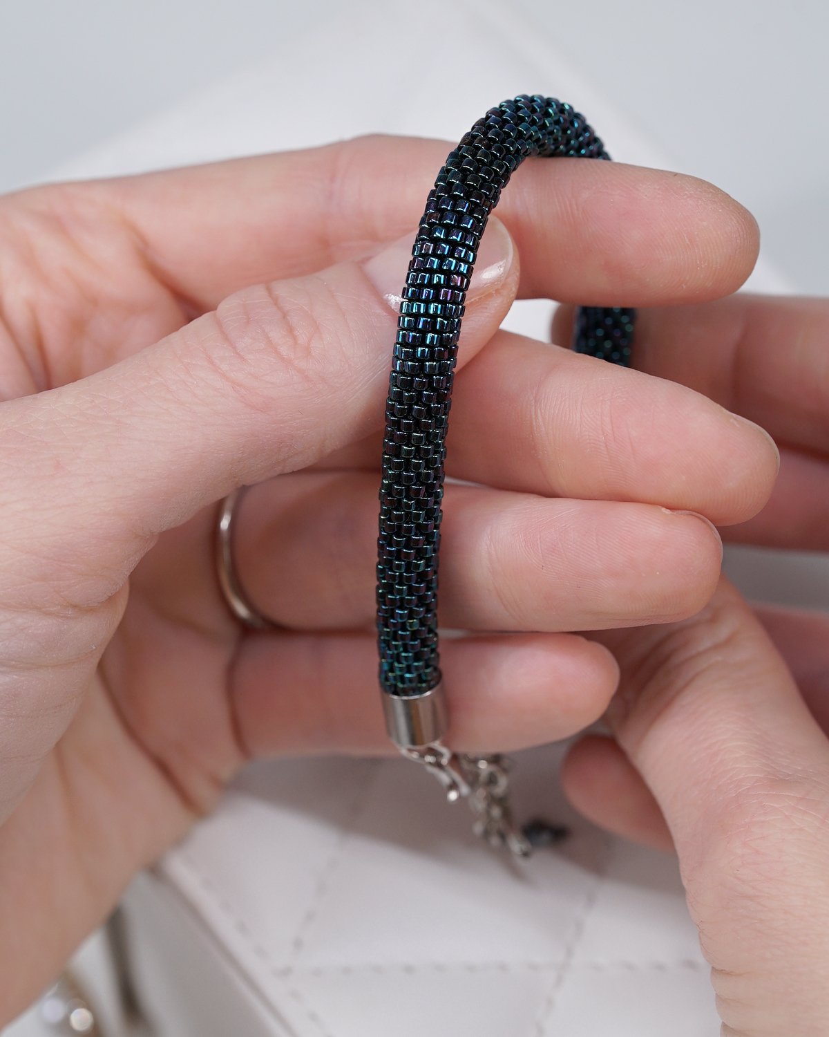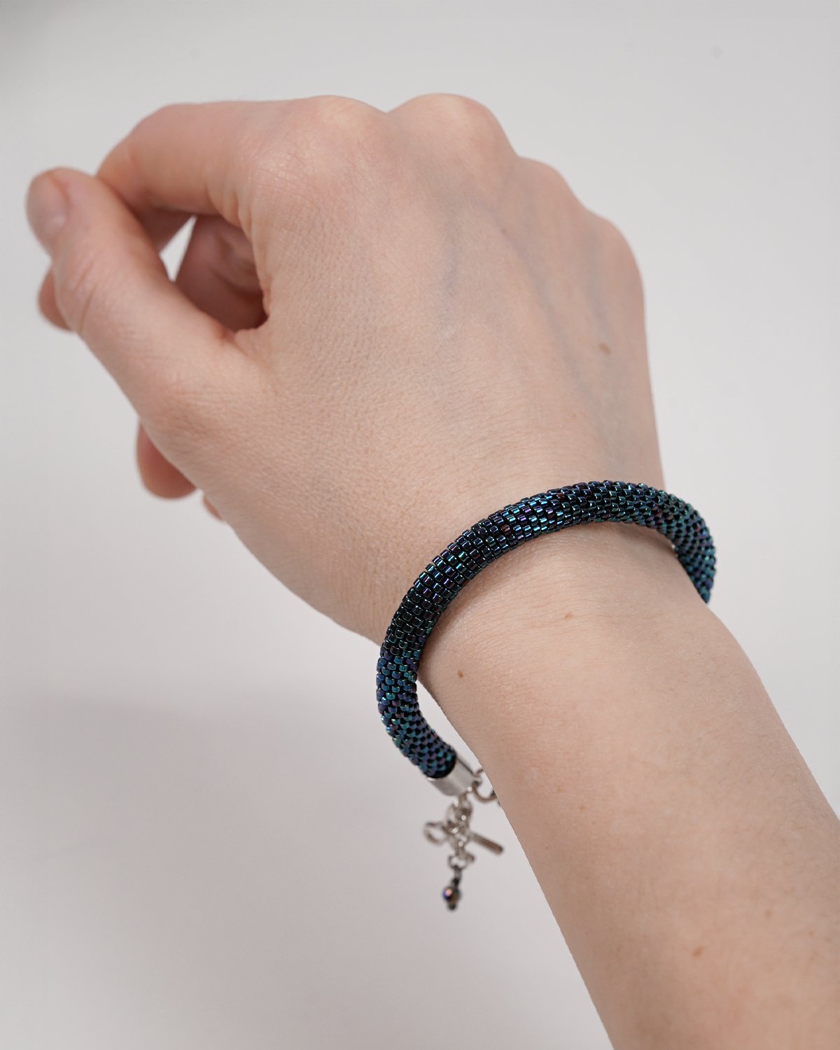 Using an intricate crochet beadwork technique, each bead is carefully woven into a seamless tubular form. The result is a soft, flexible bracelet that sits comfortably on the wrist while maintaining durability.