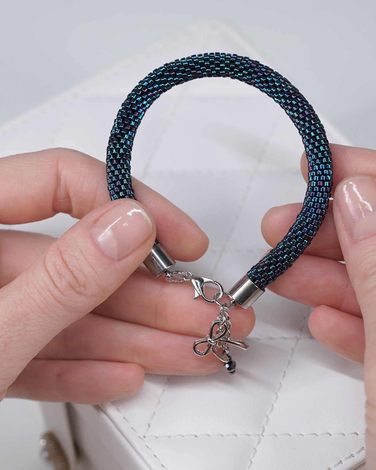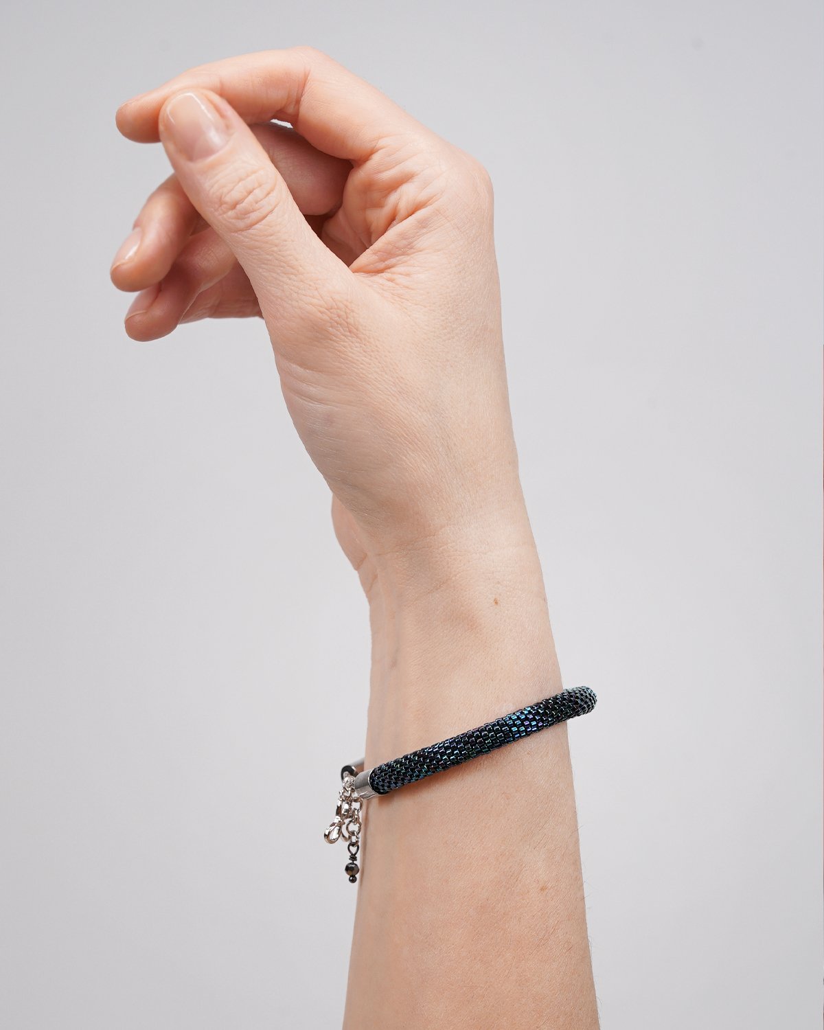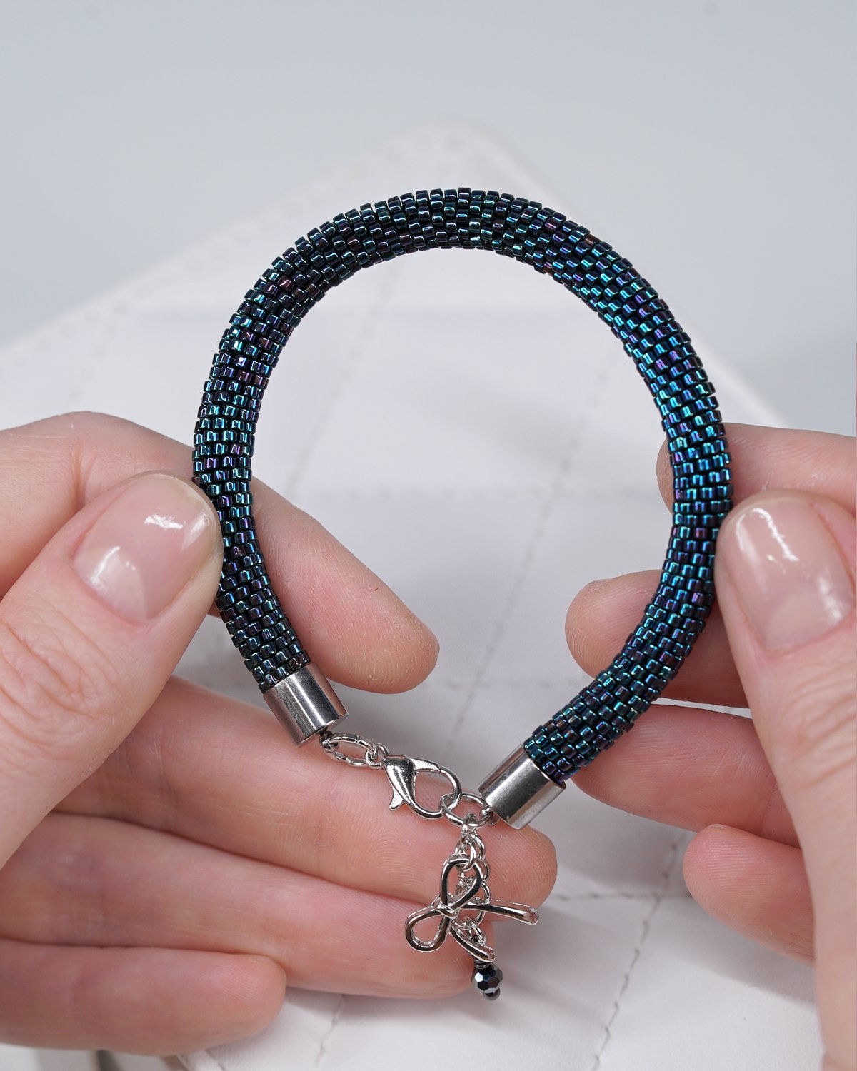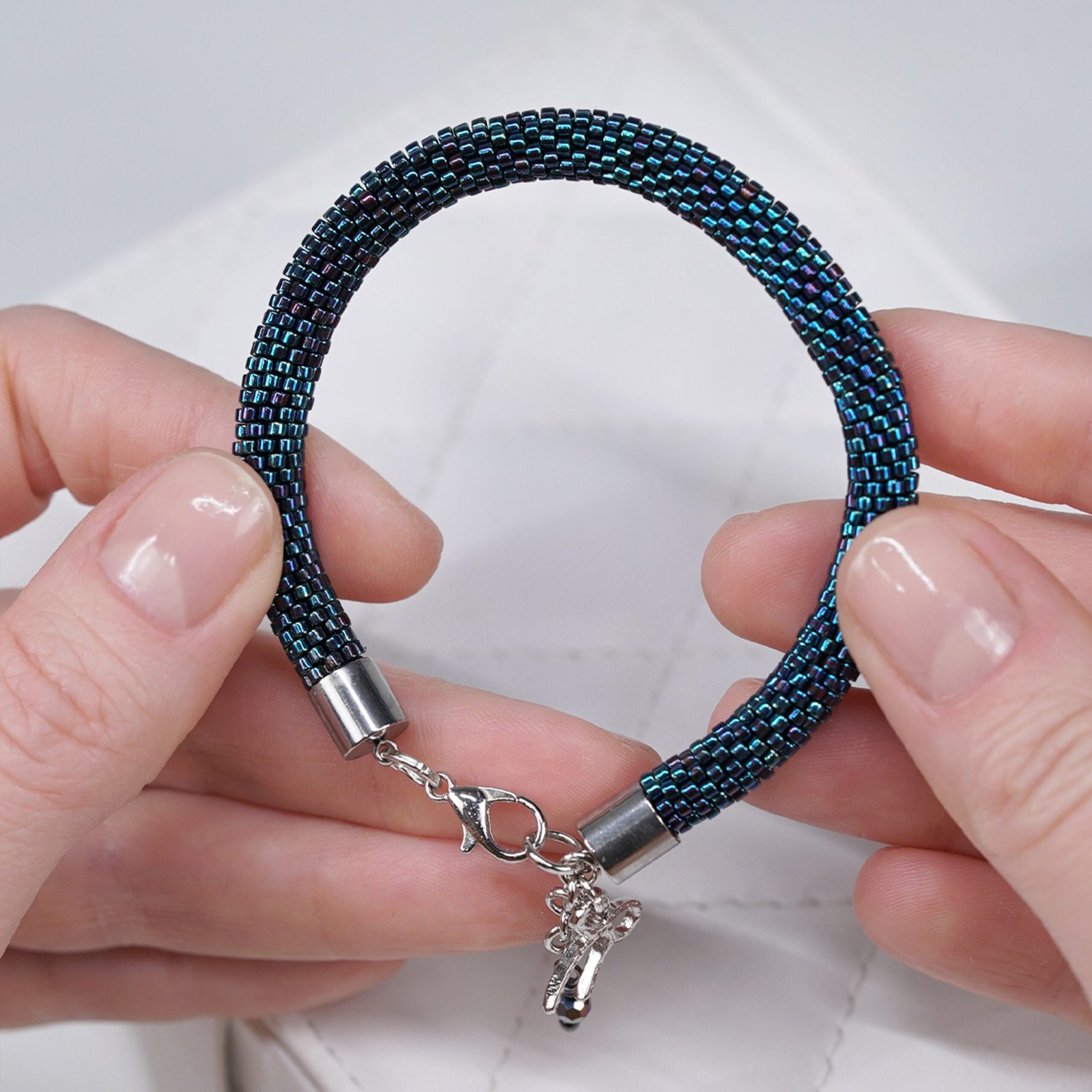 Using an intricate crochet beadwork technique, each bead is carefully woven into a seamless tubular form. The result is a soft, flexible bracelet that sits comfortably on the wrist while maintaining durability.