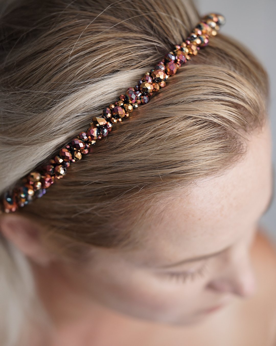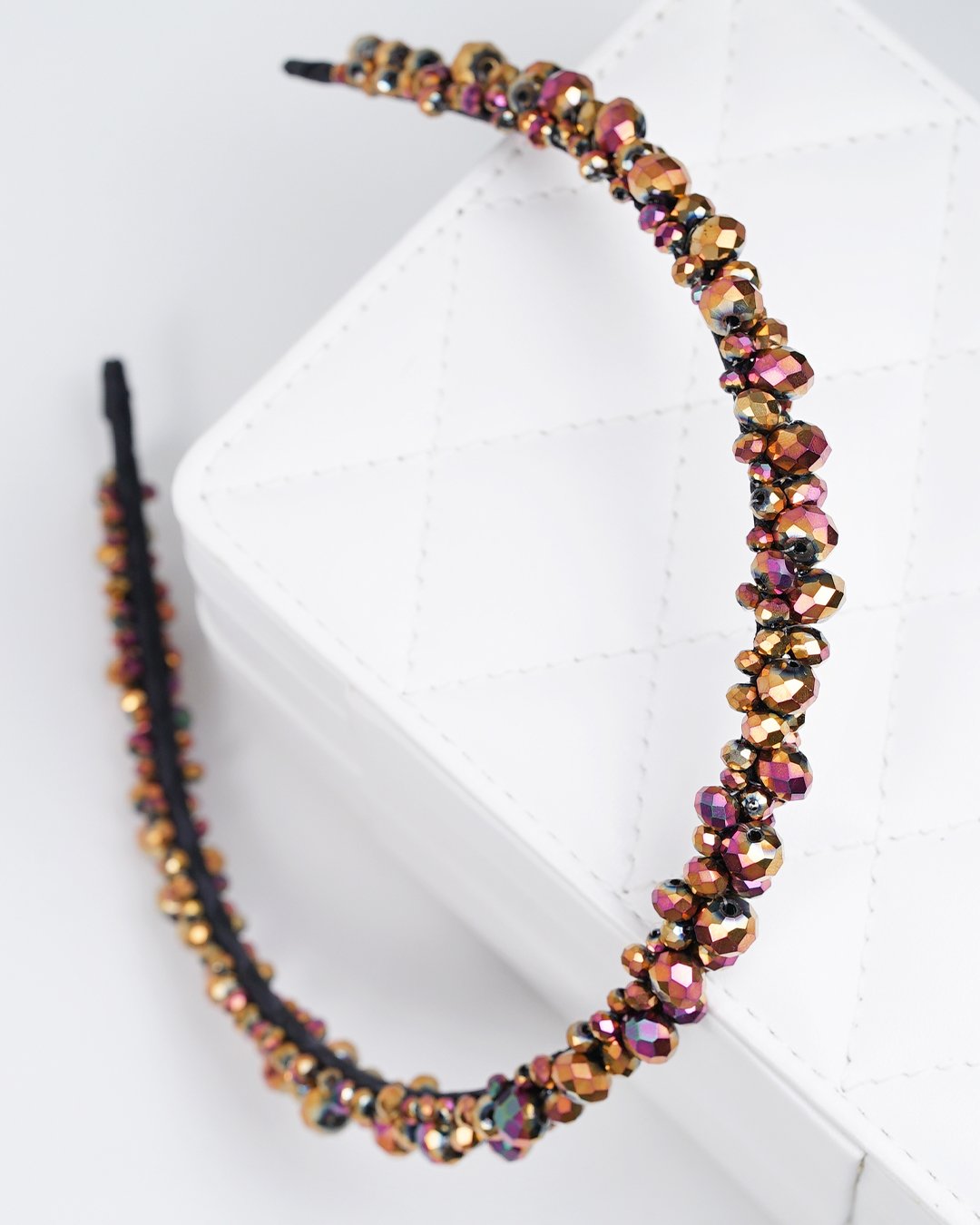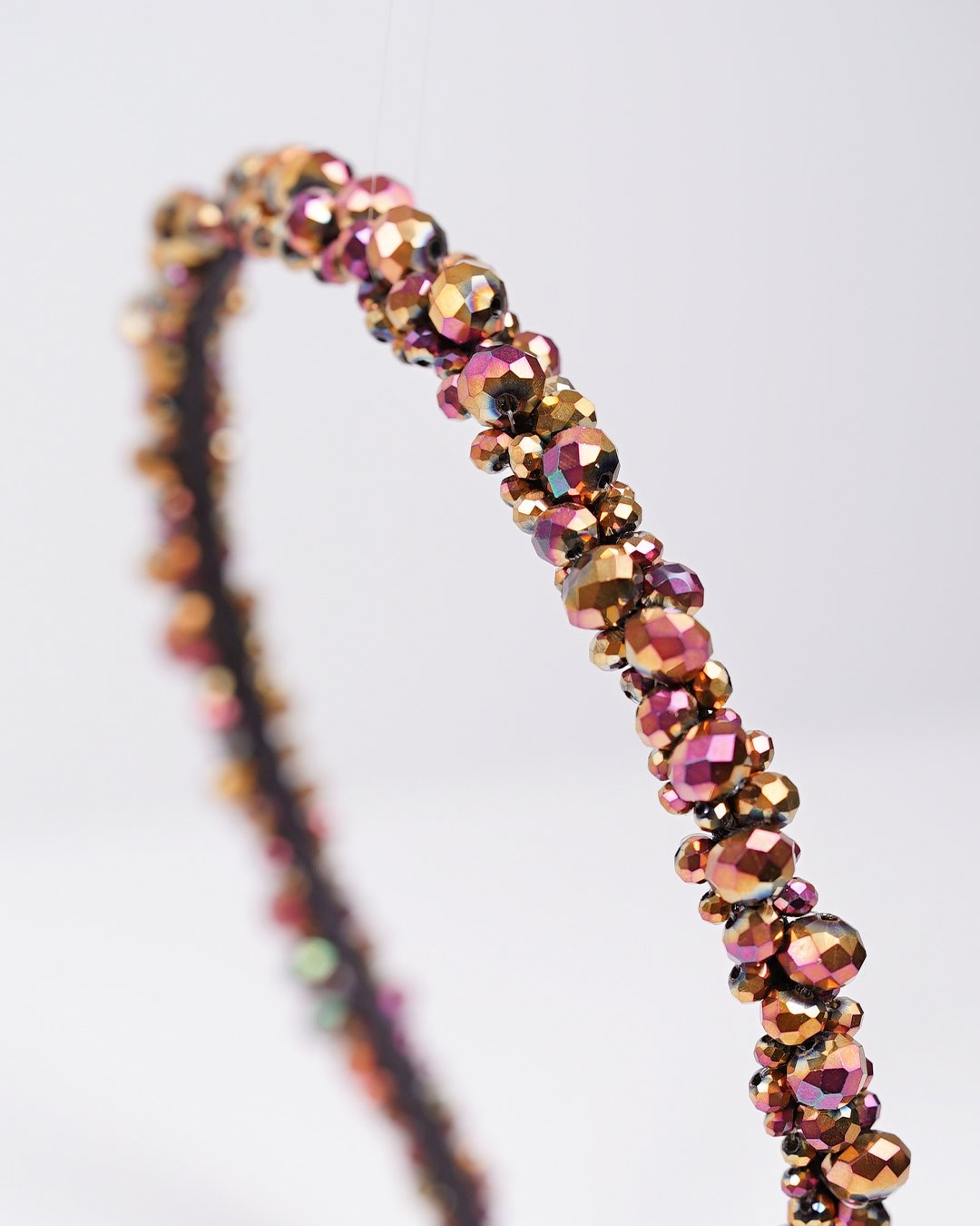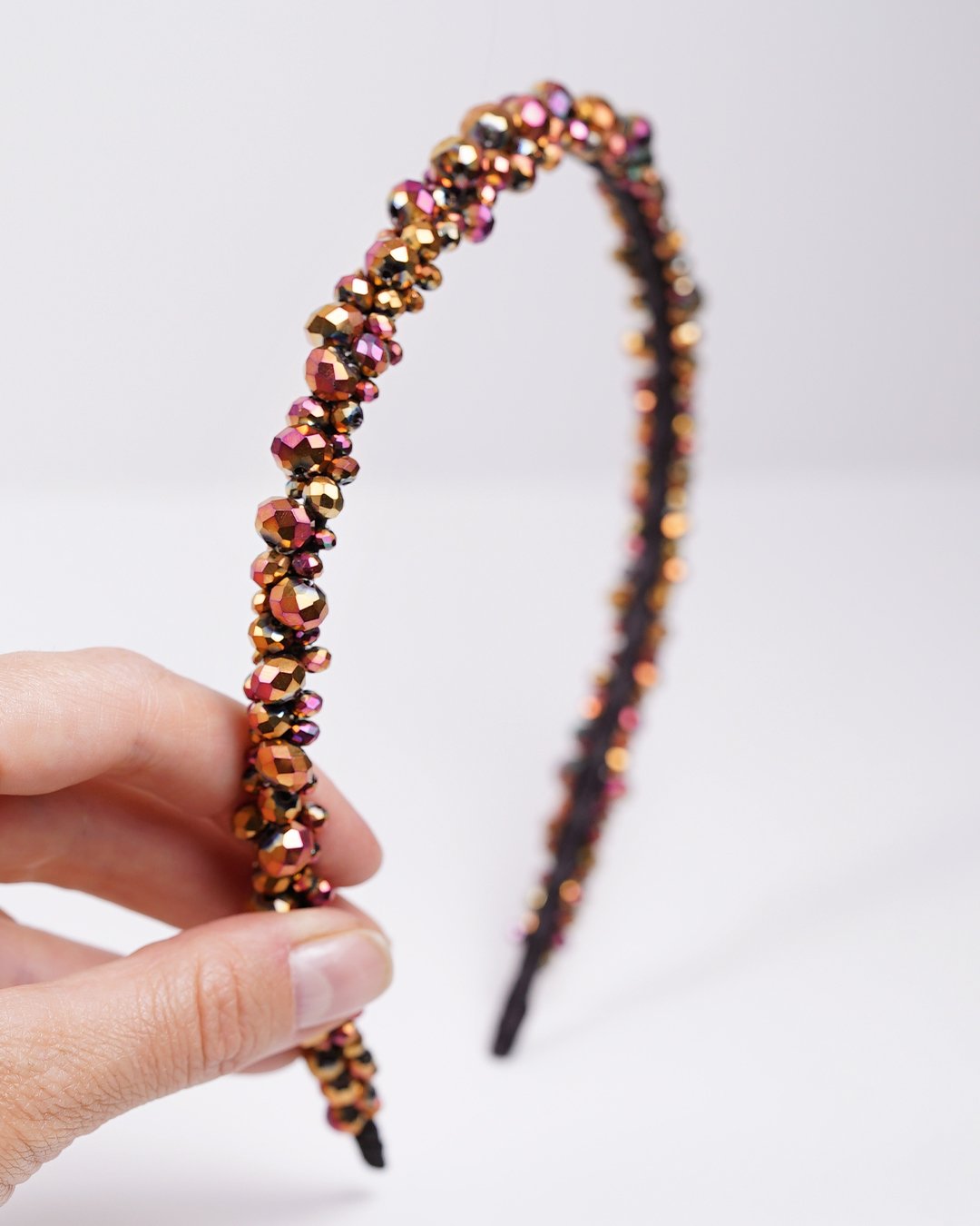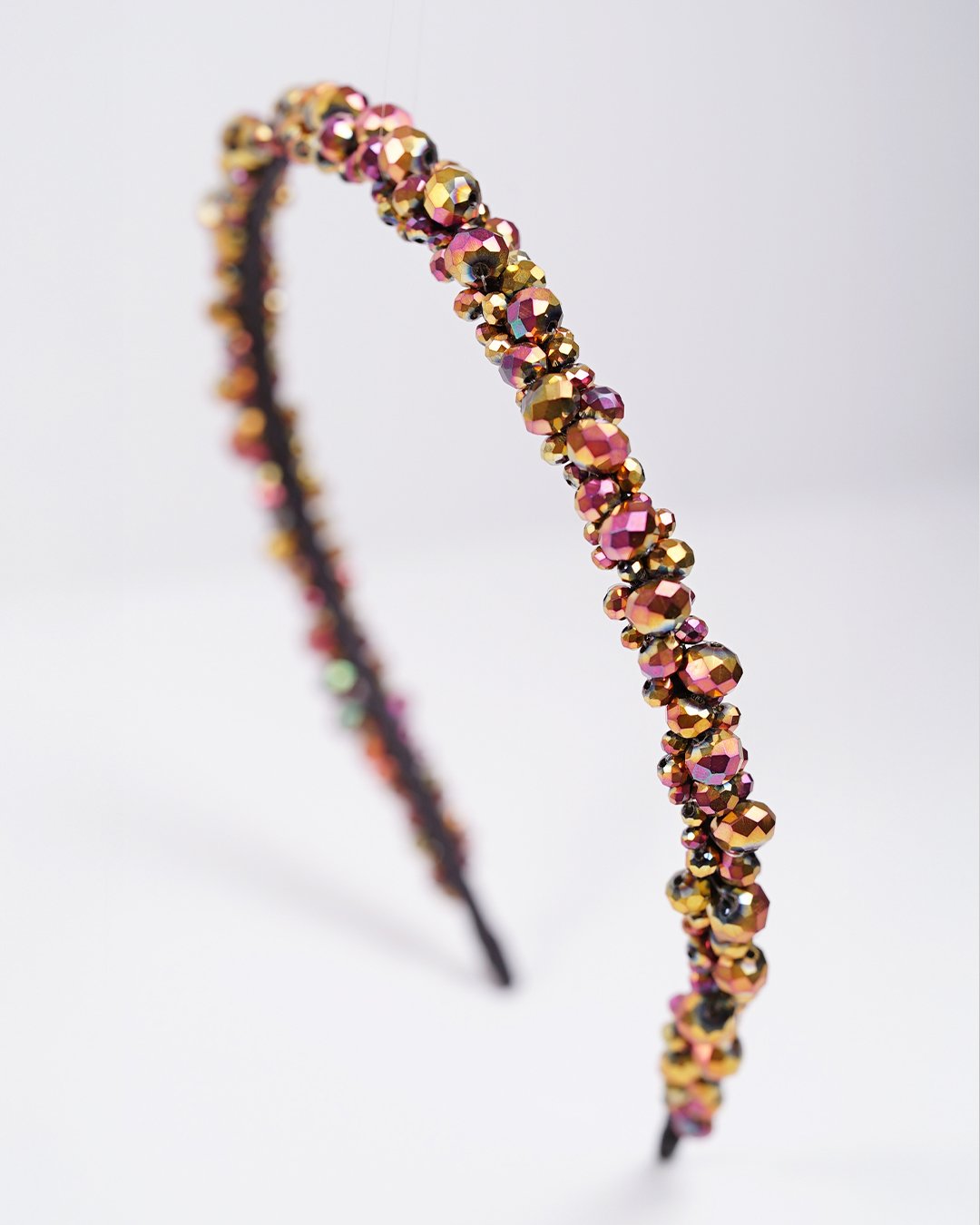 Turn heads with our Rosé Spark Beaded Headband, a handcrafted piece that radiates elegance and confidence. Covered in richly faceted glass beads in shades of rose gold, berry, and golden bronze, this headband catches and reflects light beautifully – adding shimmer to any hairstyle.