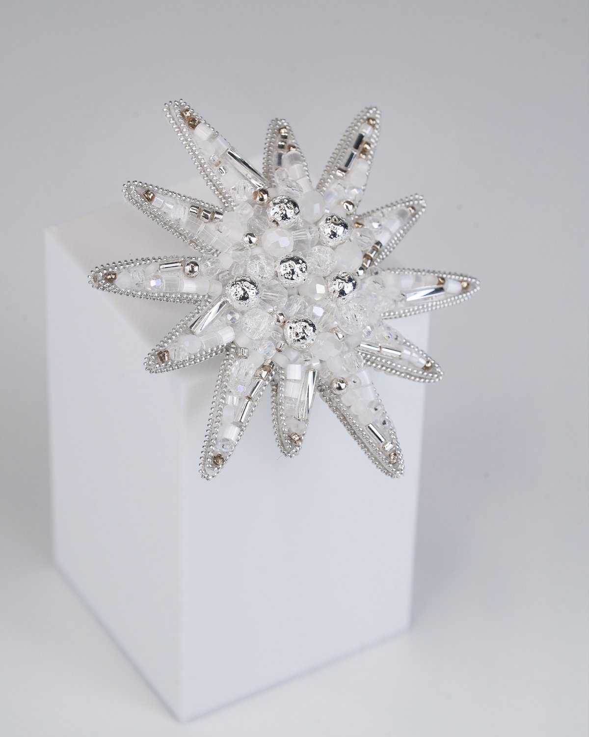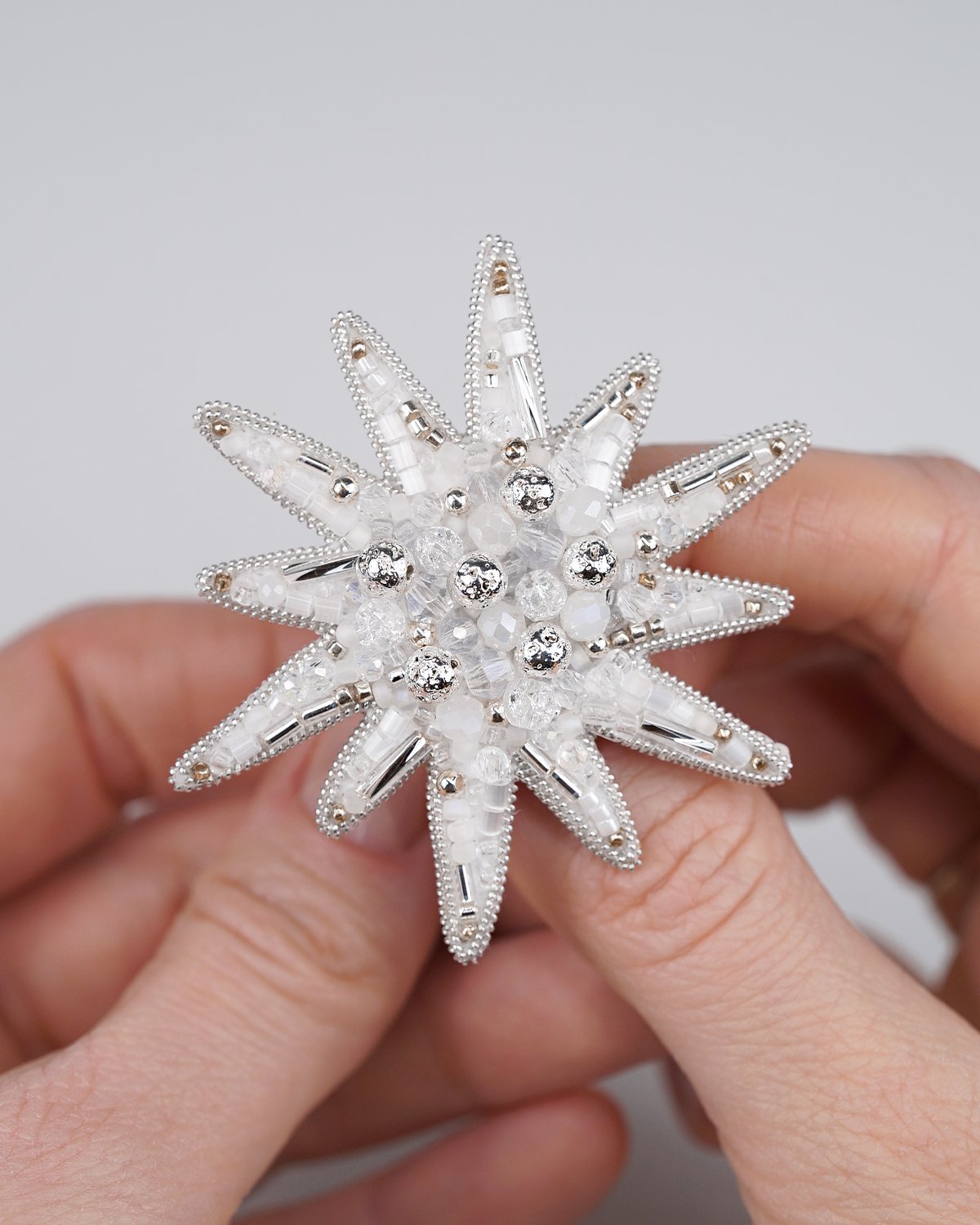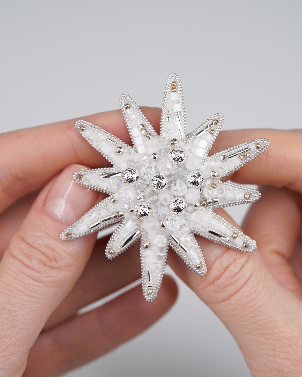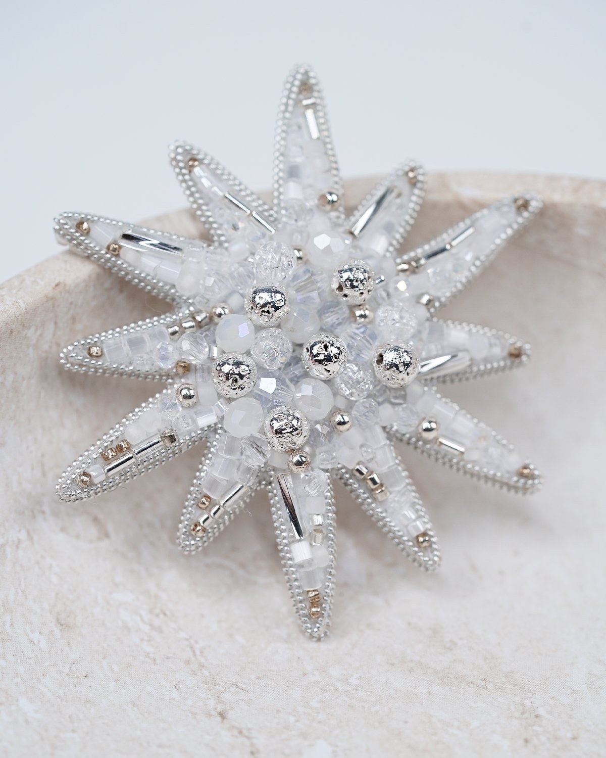 A handcrafted silver star brooch made with Swarovski crystal beads, featuring a unique 12-ray design. Sparkling and elegant, it adds a magical, luminous touch to any outfit.