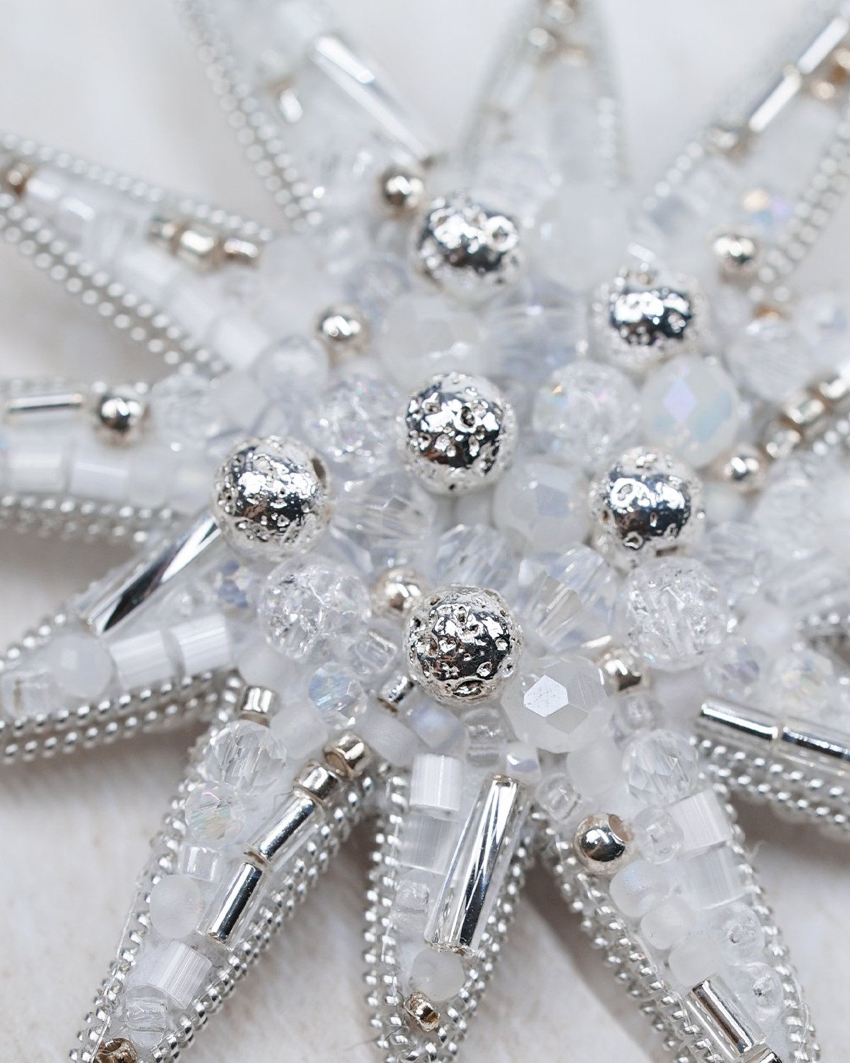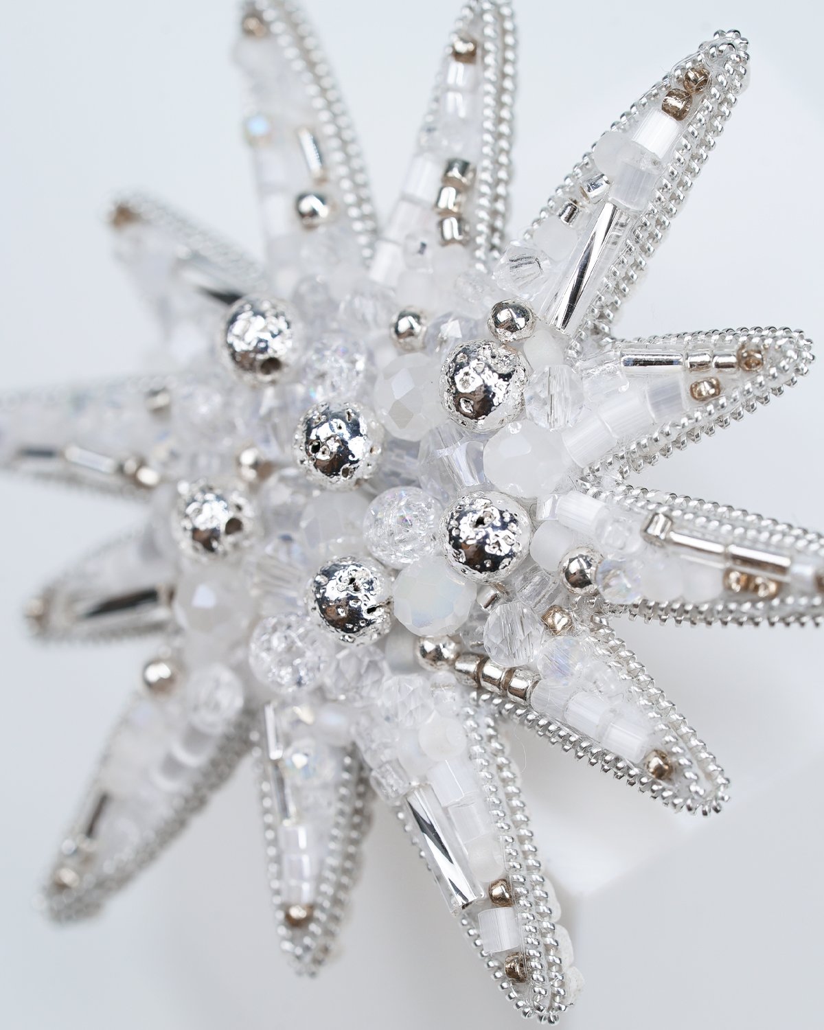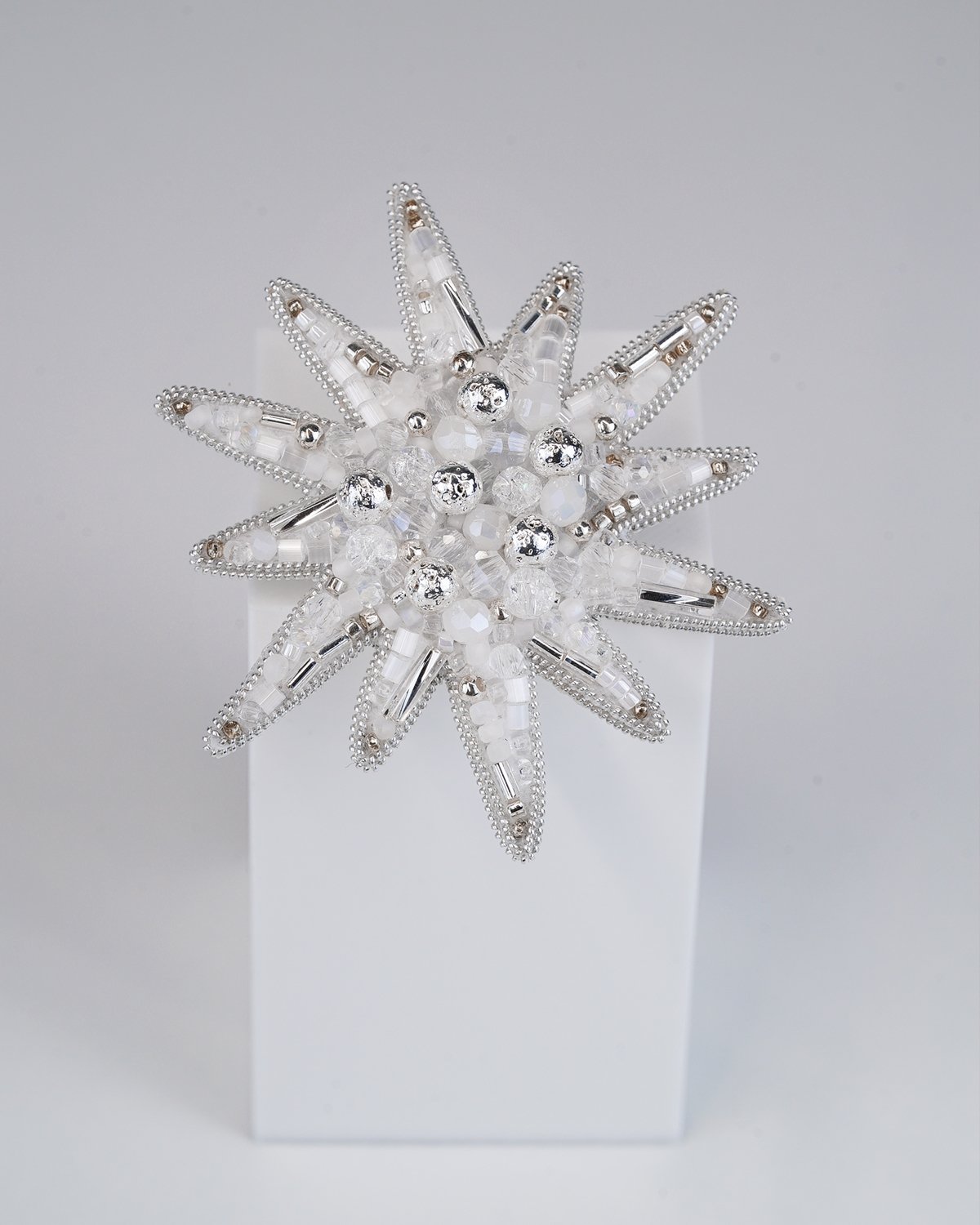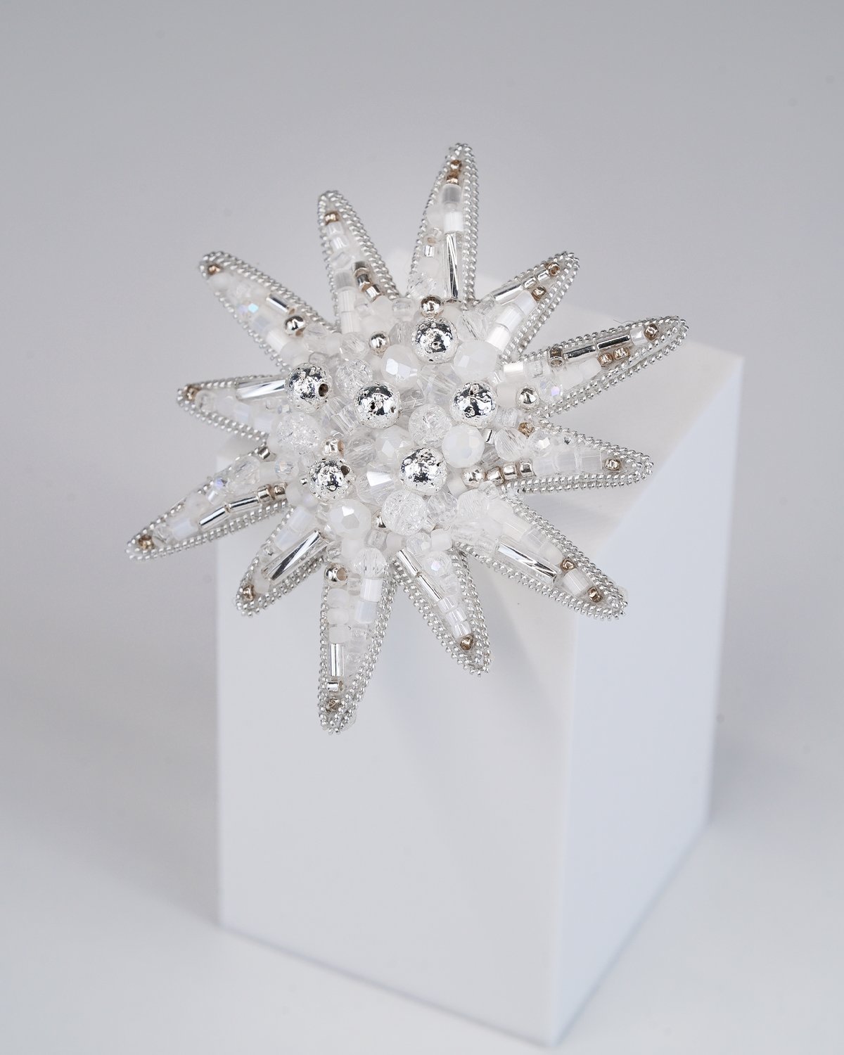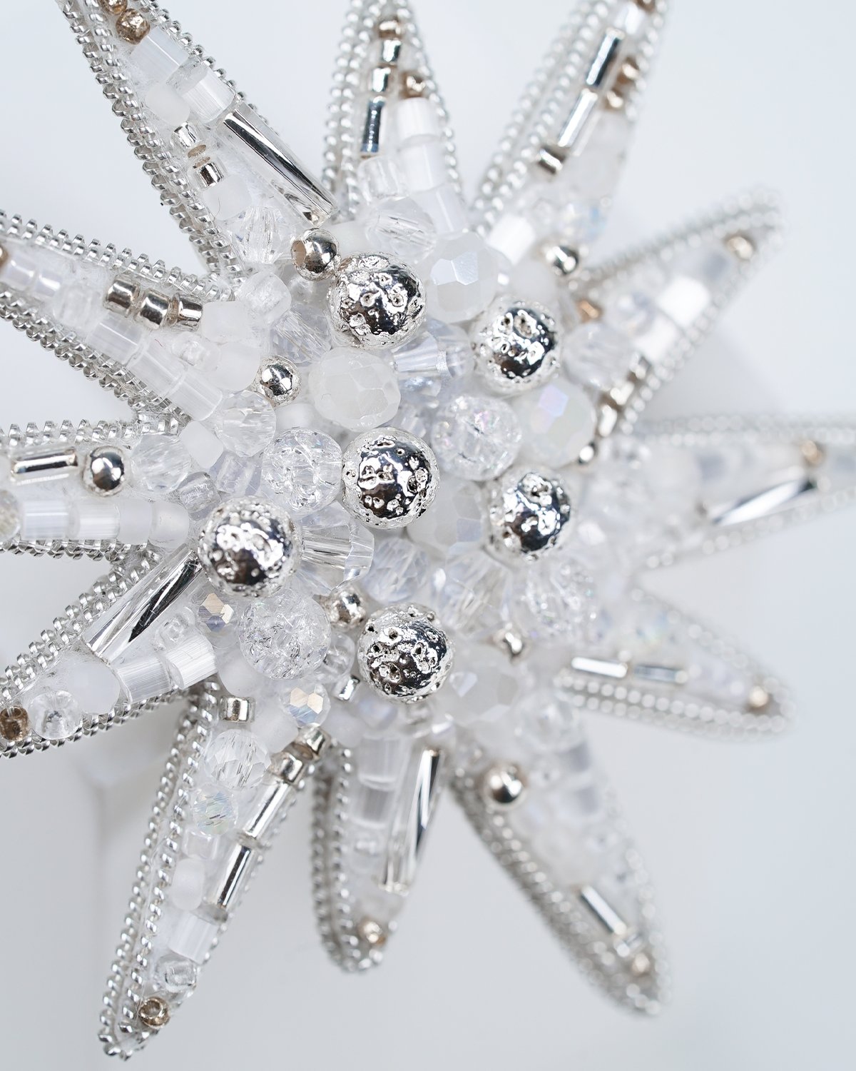 A handcrafted silver star brooch made with Swarovski crystal beads, featuring a unique 12-ray design. Sparkling and elegant, it adds a magical, luminous touch to any outfit.