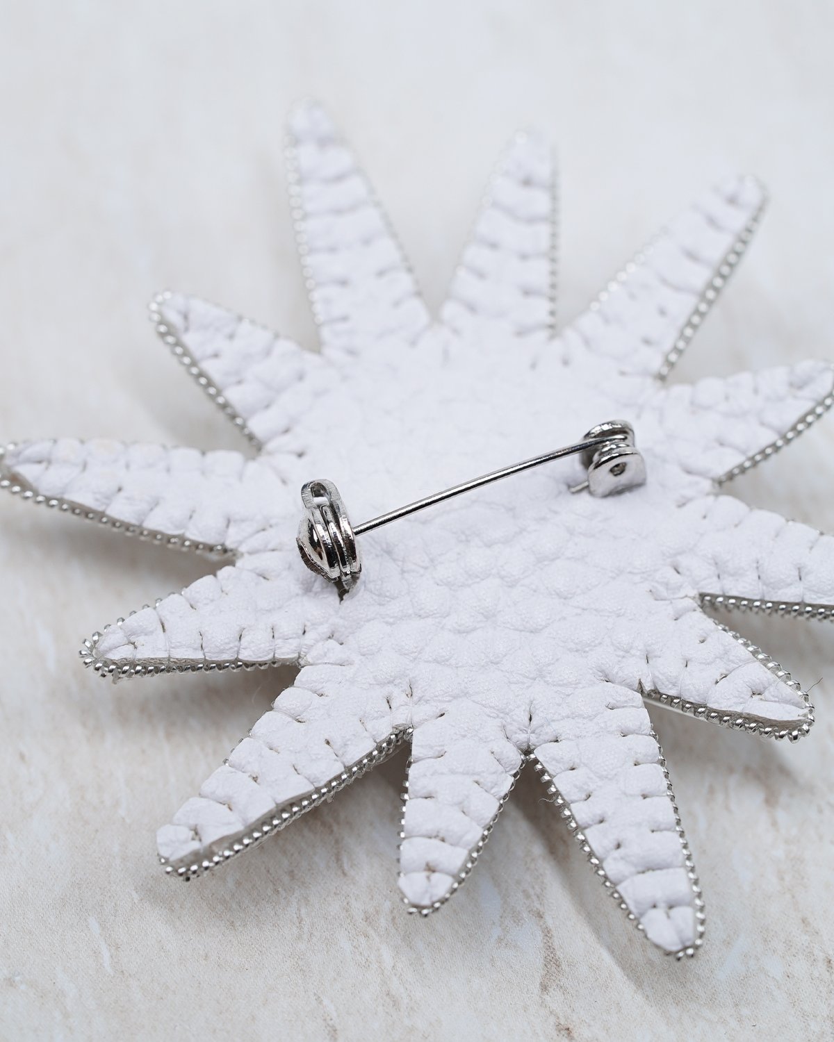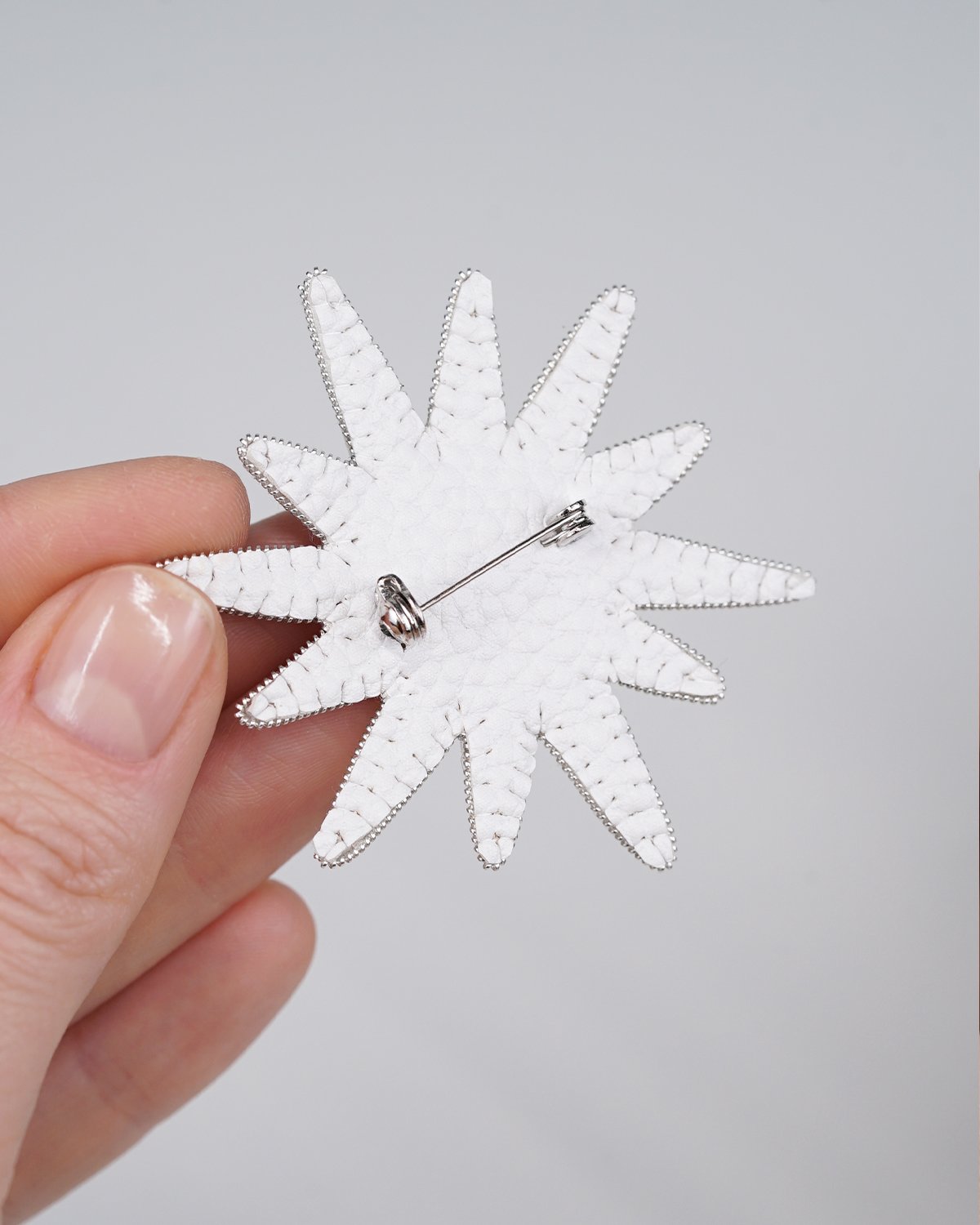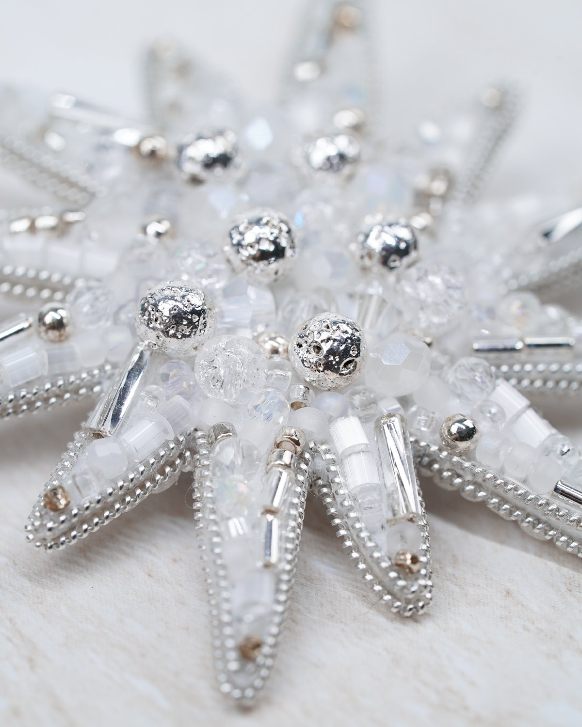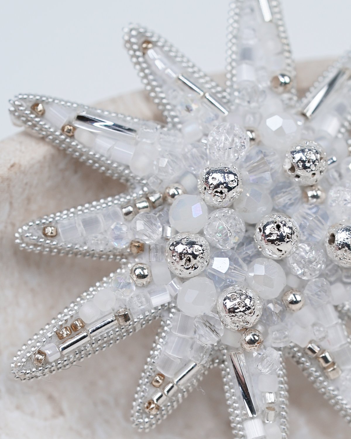 A handcrafted silver star brooch made with Swarovski crystal beads, featuring a unique 12-ray design. Sparkling and elegant, it adds a magical, luminous touch to any outfit.