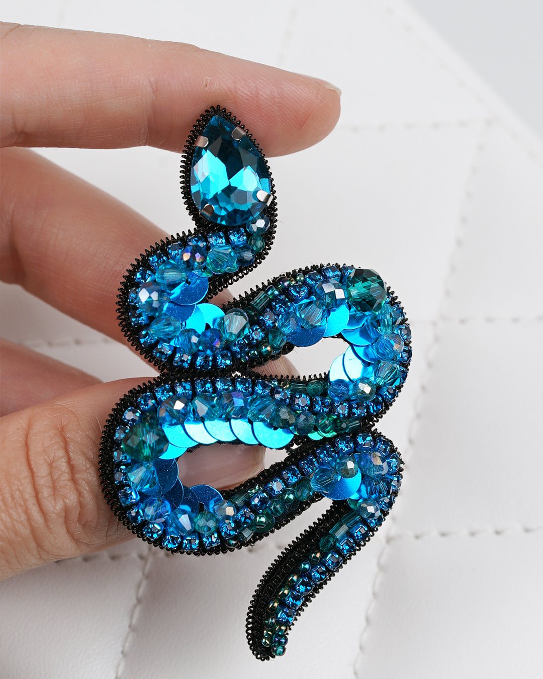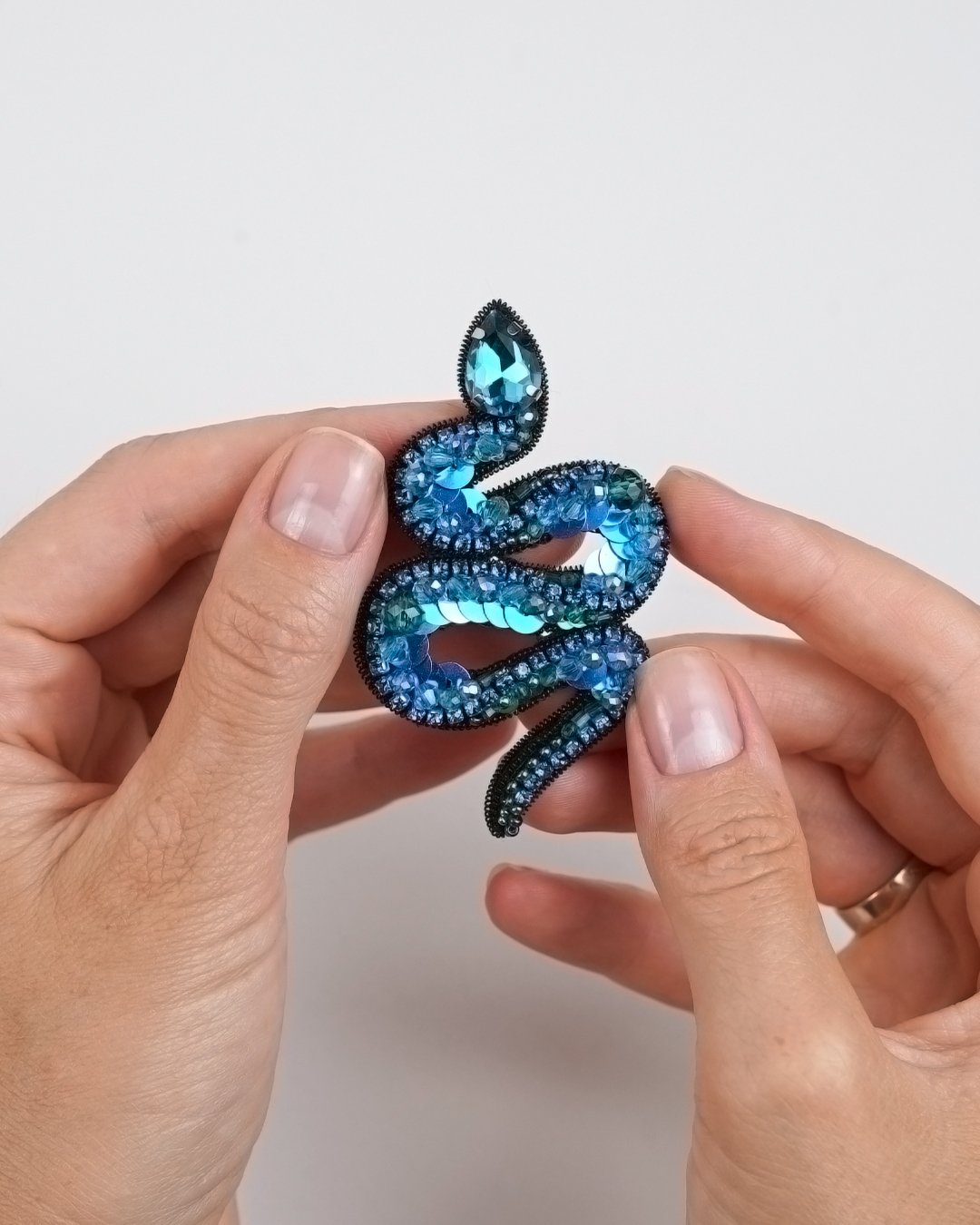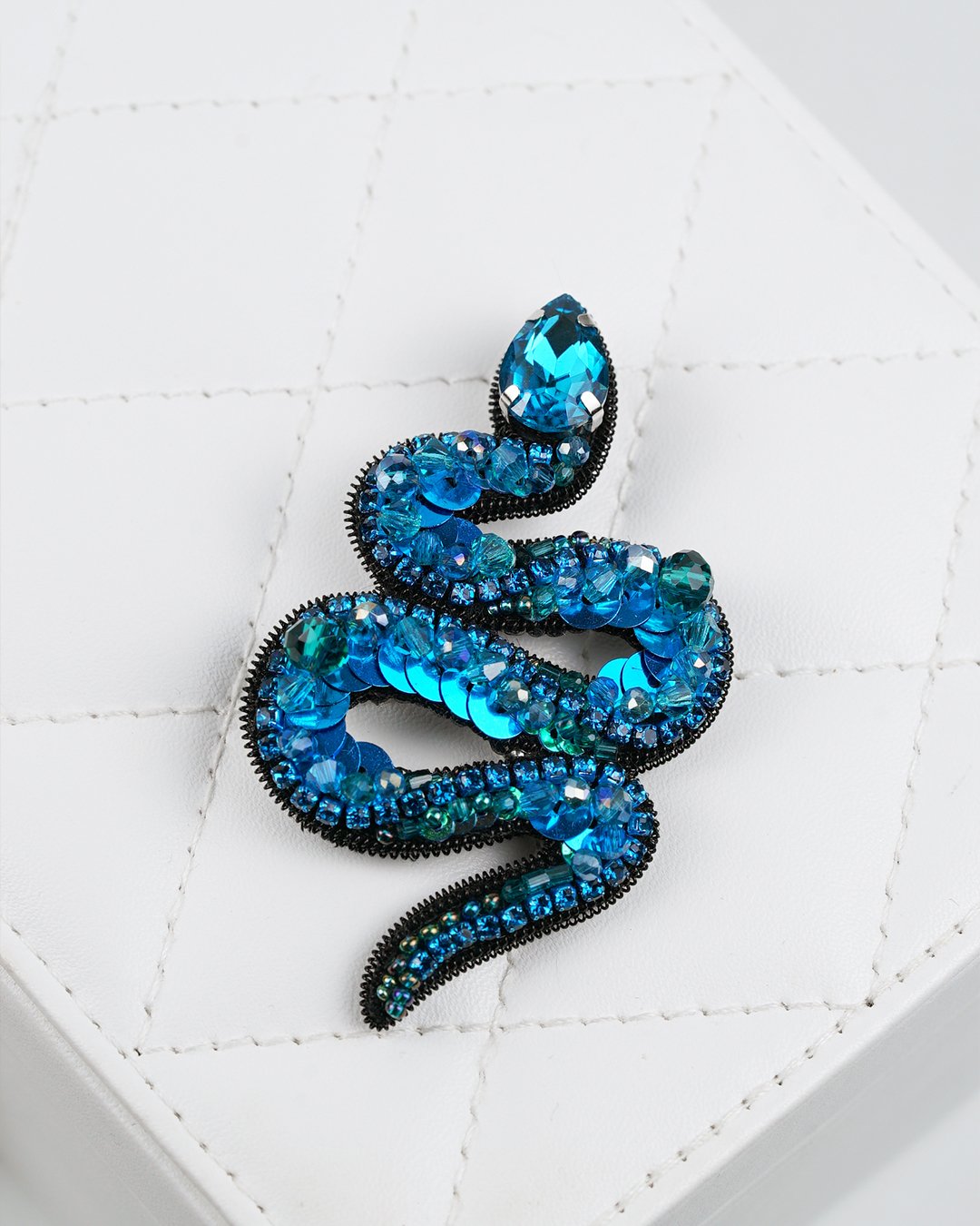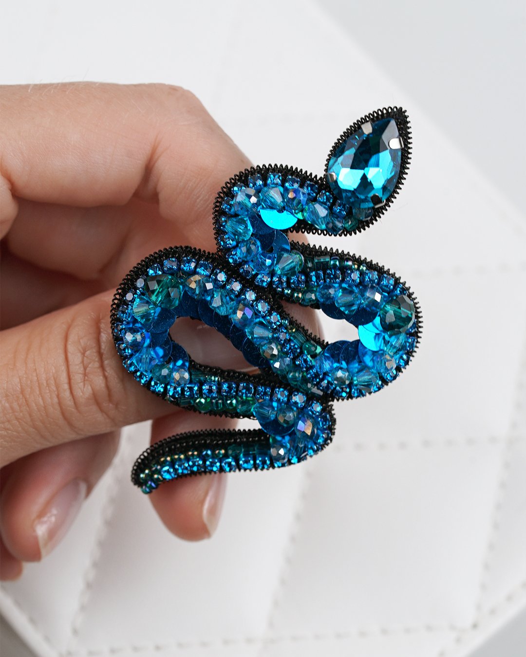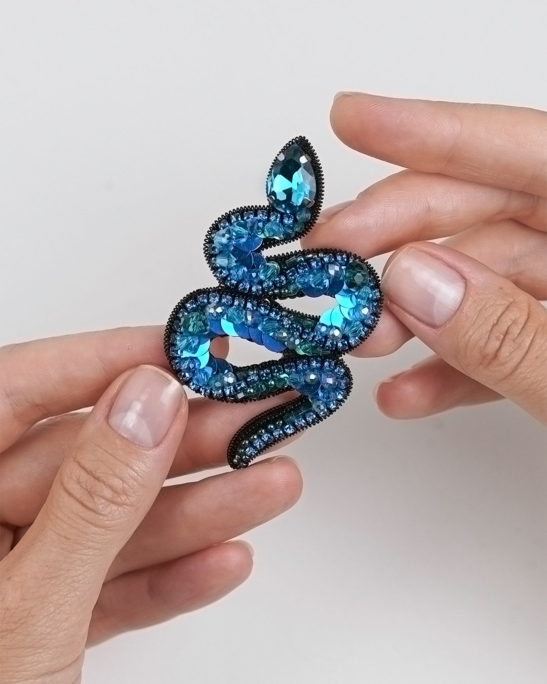 Crafted using high-quality glass crystals, Swarovski crystal beads, rhinestones, sequins, and Czech and Miyuki seed beads, the brooch glimmers with hypnotic beauty from every angle. A large teardrop crystal forms the snake’s head, while its coiled body shimmers with layered textures and light-catching accents in shades of turquoise, teal, and ocean blue.