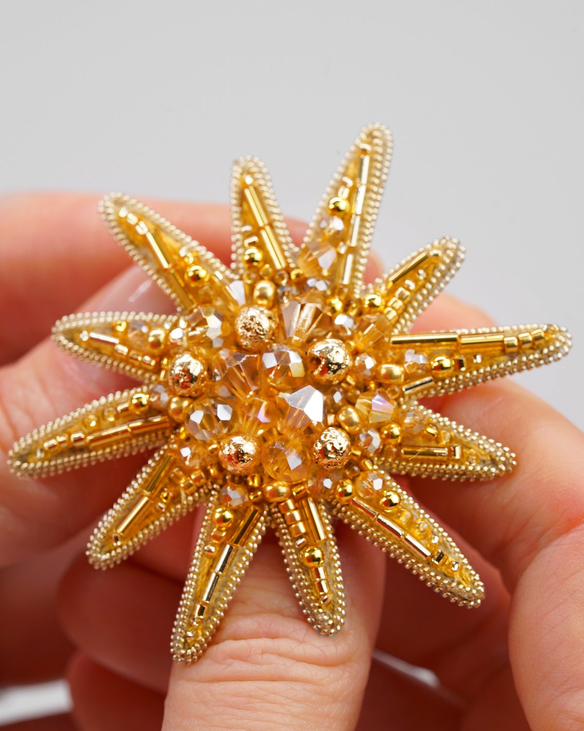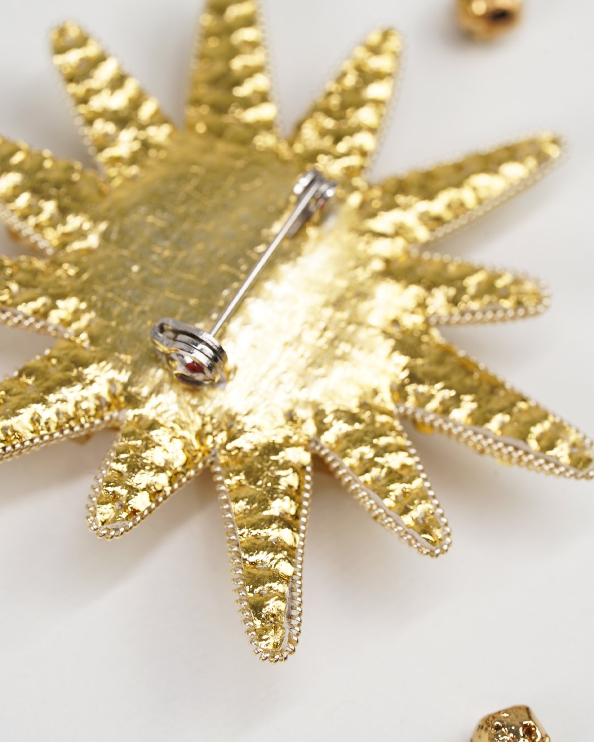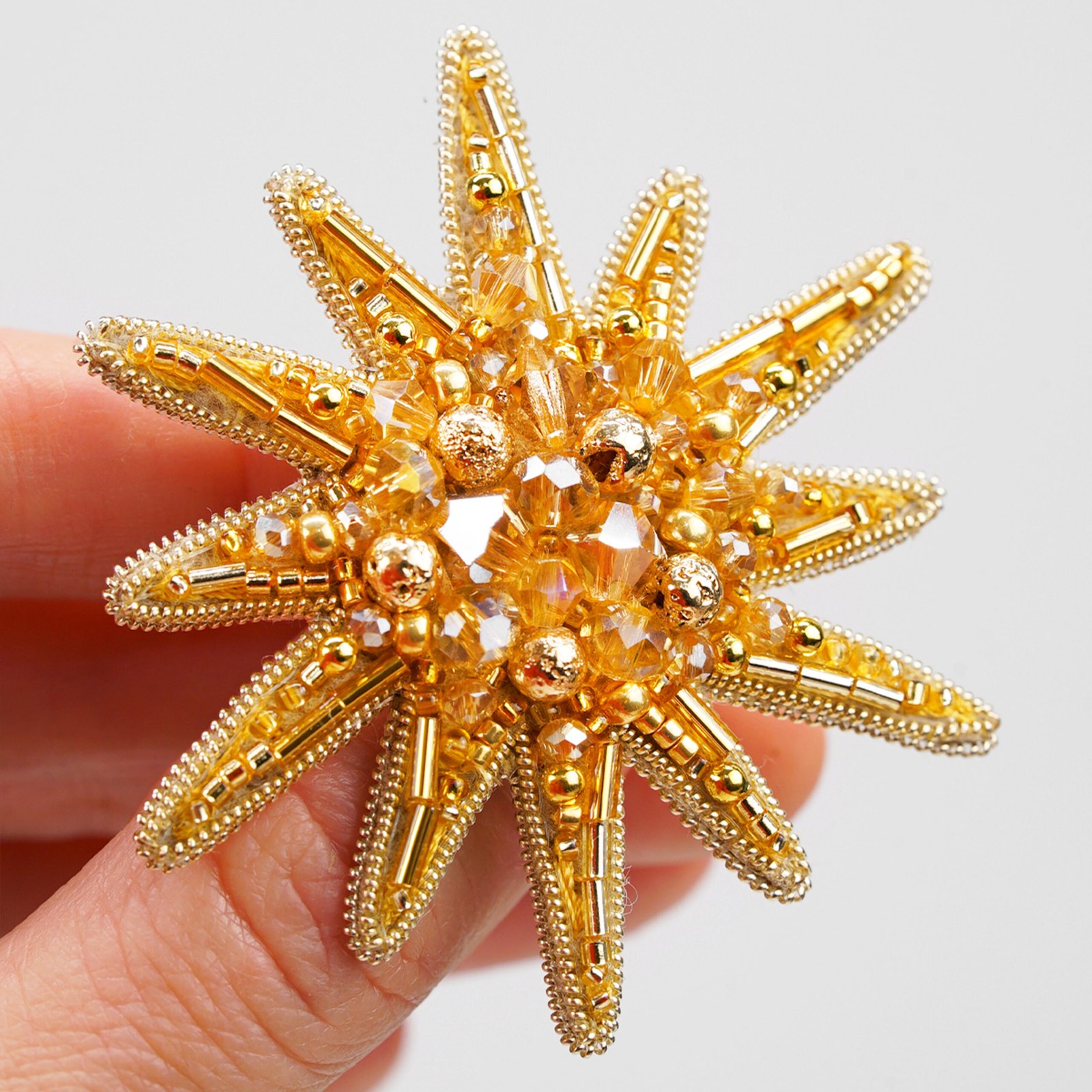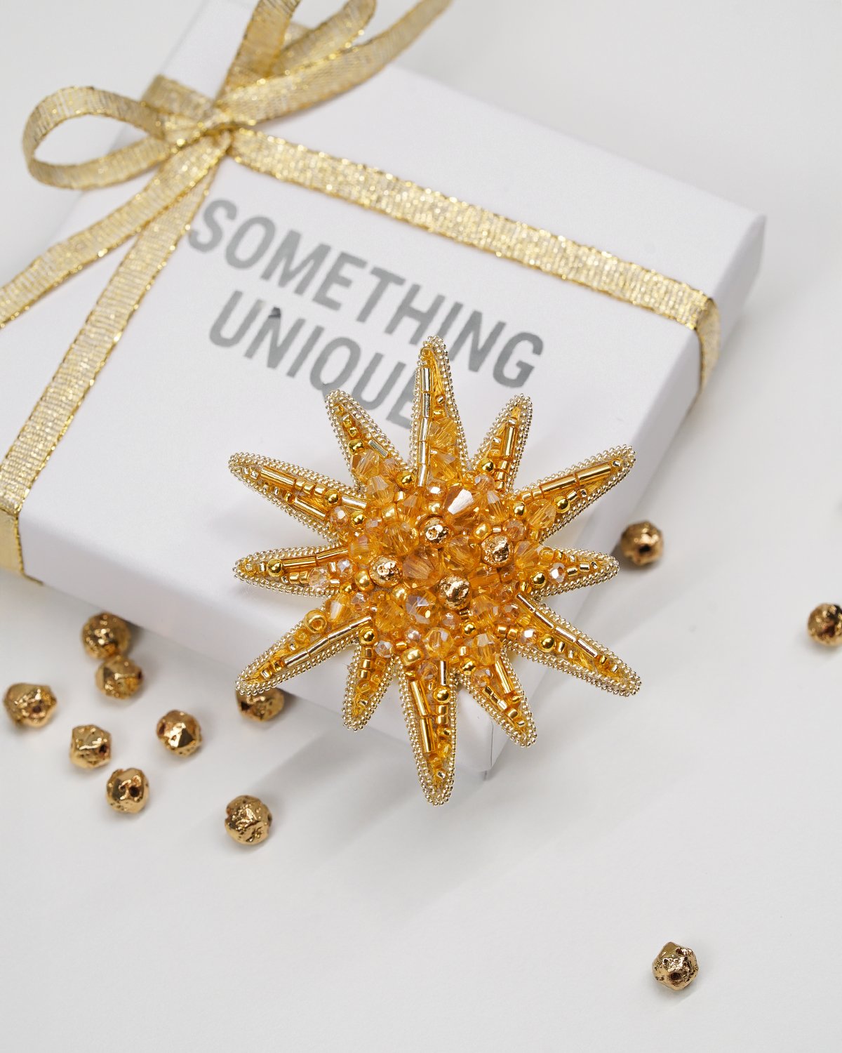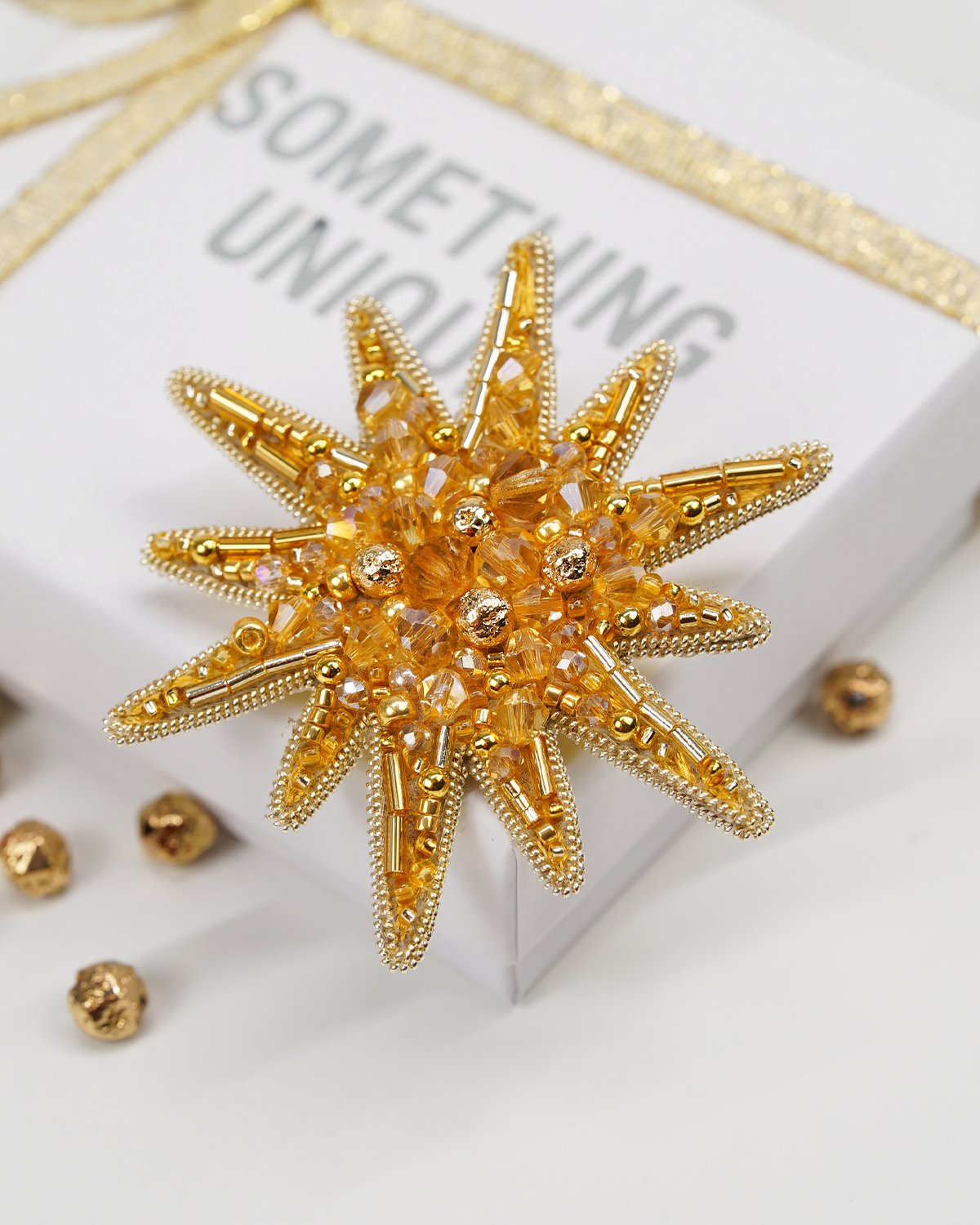 The brooch is handcrafted using a refined mix of golden tones, featuring Swarovski crystal beads, shimmering faceted glass beads, and elegant metal elements. Each material is chosen to enhance light reflection, creating a radiant glow that truly resembles the brilliance of the sun.