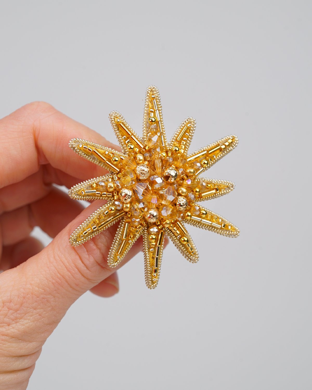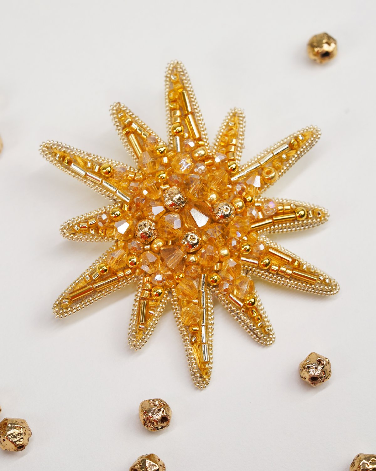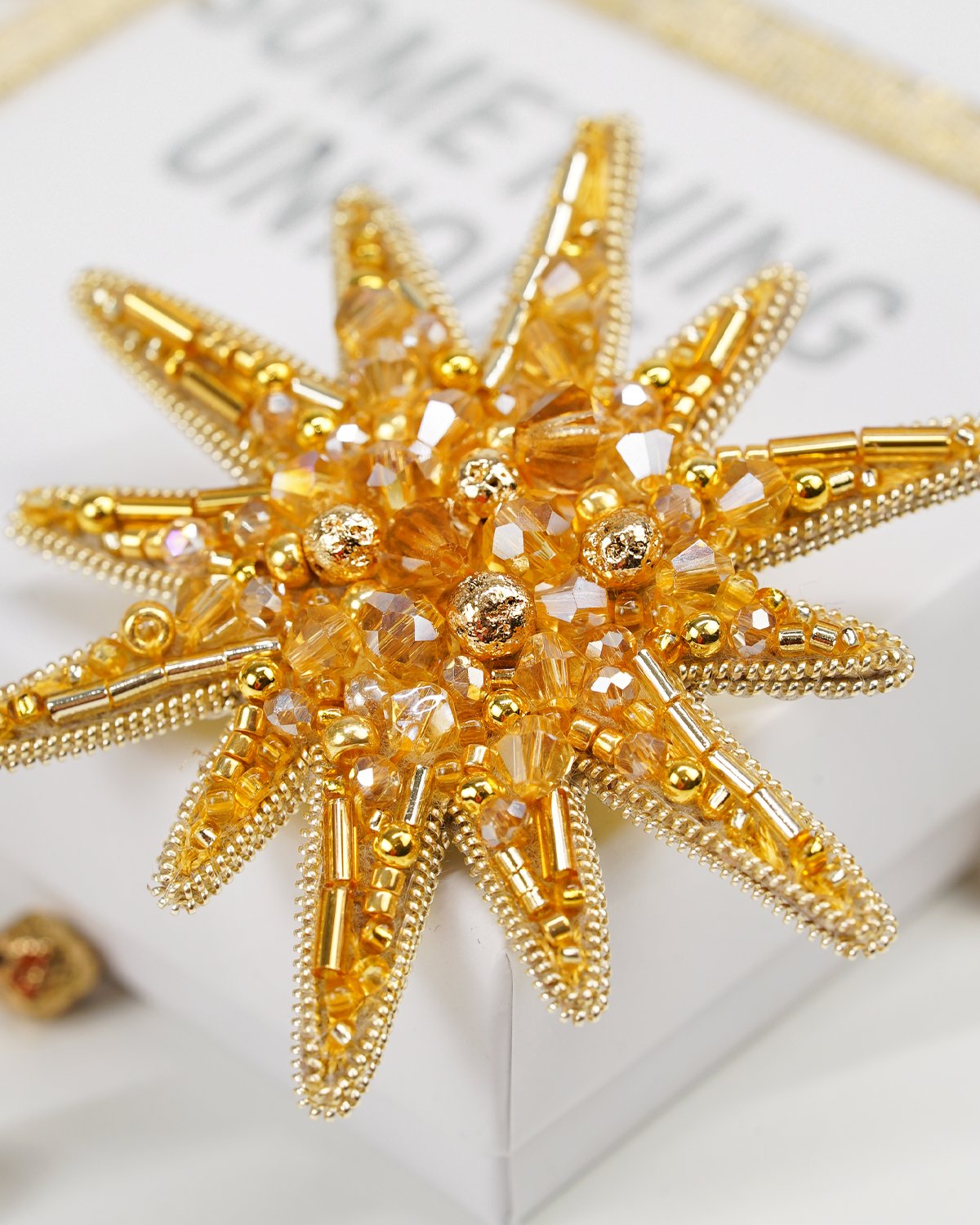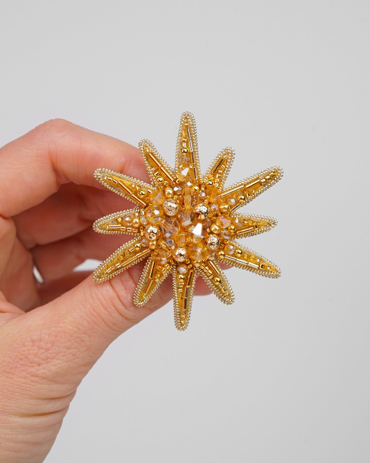 A handcrafted Gold Beaded Sun Brooch featuring a symbolic 12-ray star representing harmony and wholeness. Made with Swarovski crystal beads, faceted glass beads, and metal elements, this radiant piece shines like a real sun and adds warmth and meaning to any outfit.
