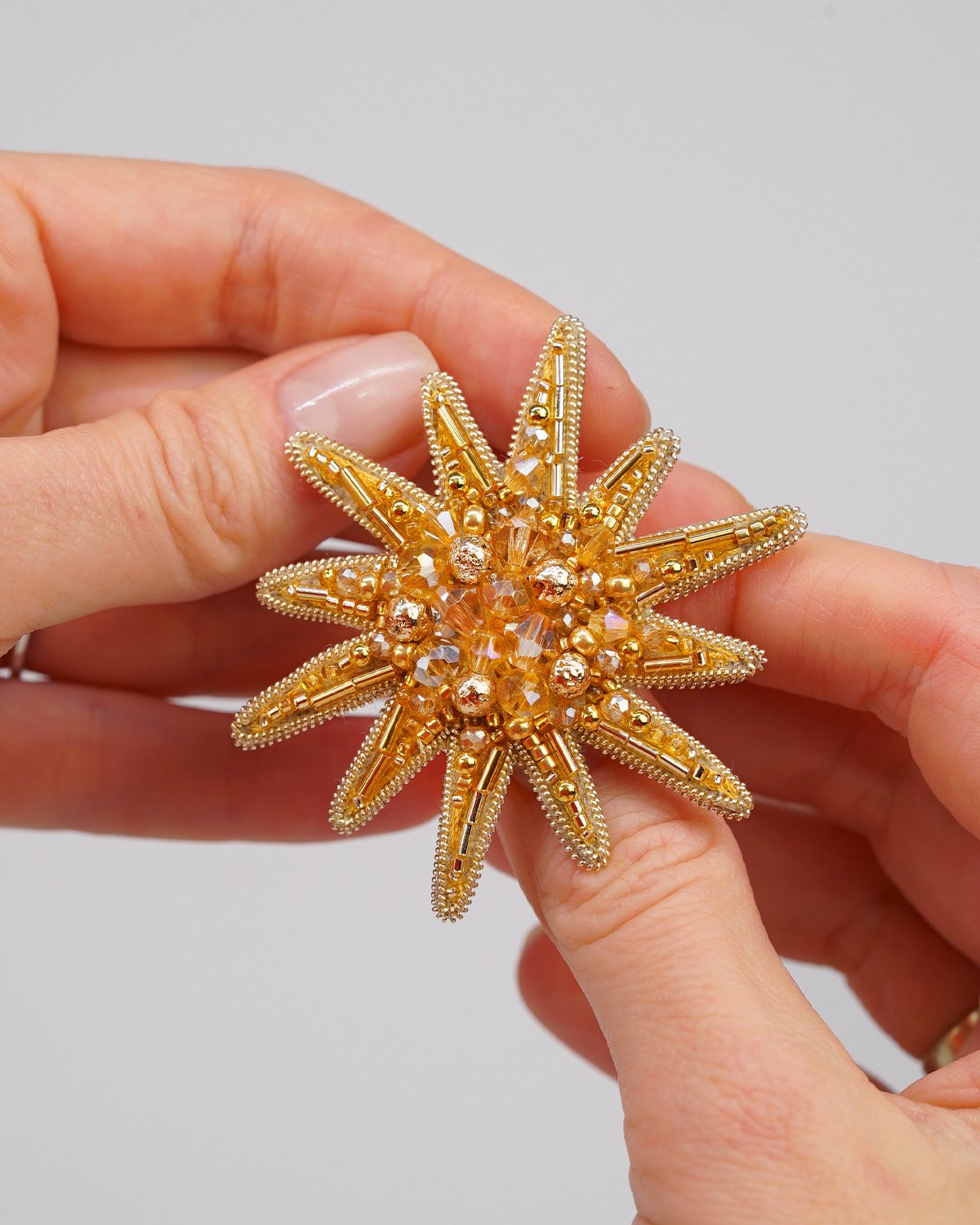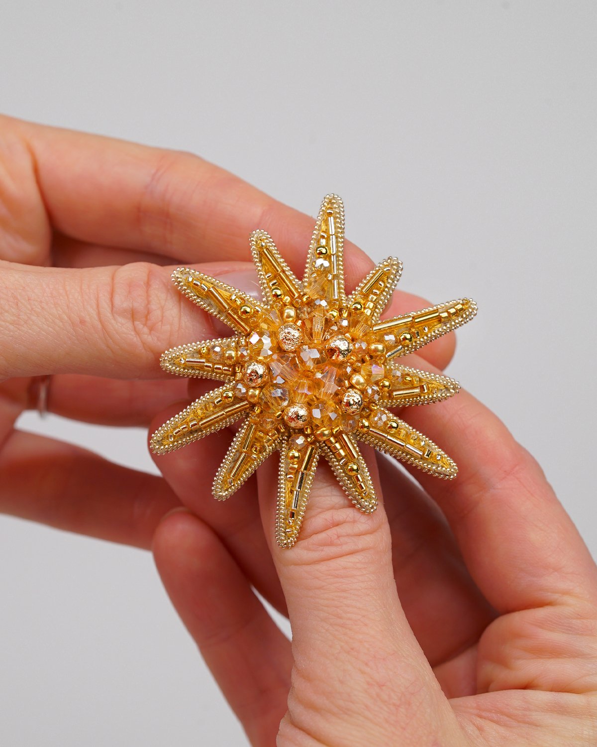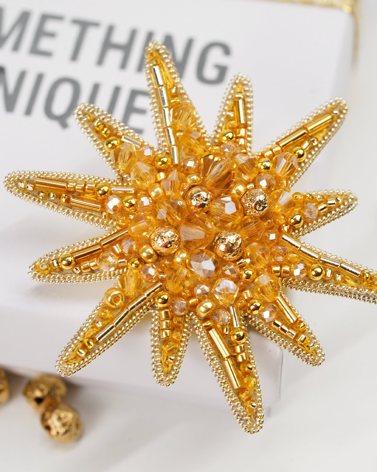 A handcrafted Gold Beaded Sun Brooch featuring a symbolic 12-ray star representing harmony and wholeness. Made with Swarovski crystal beads, faceted glass beads, and metal elements, this radiant piece shines like a real sun and adds warmth and meaning to any outfit.