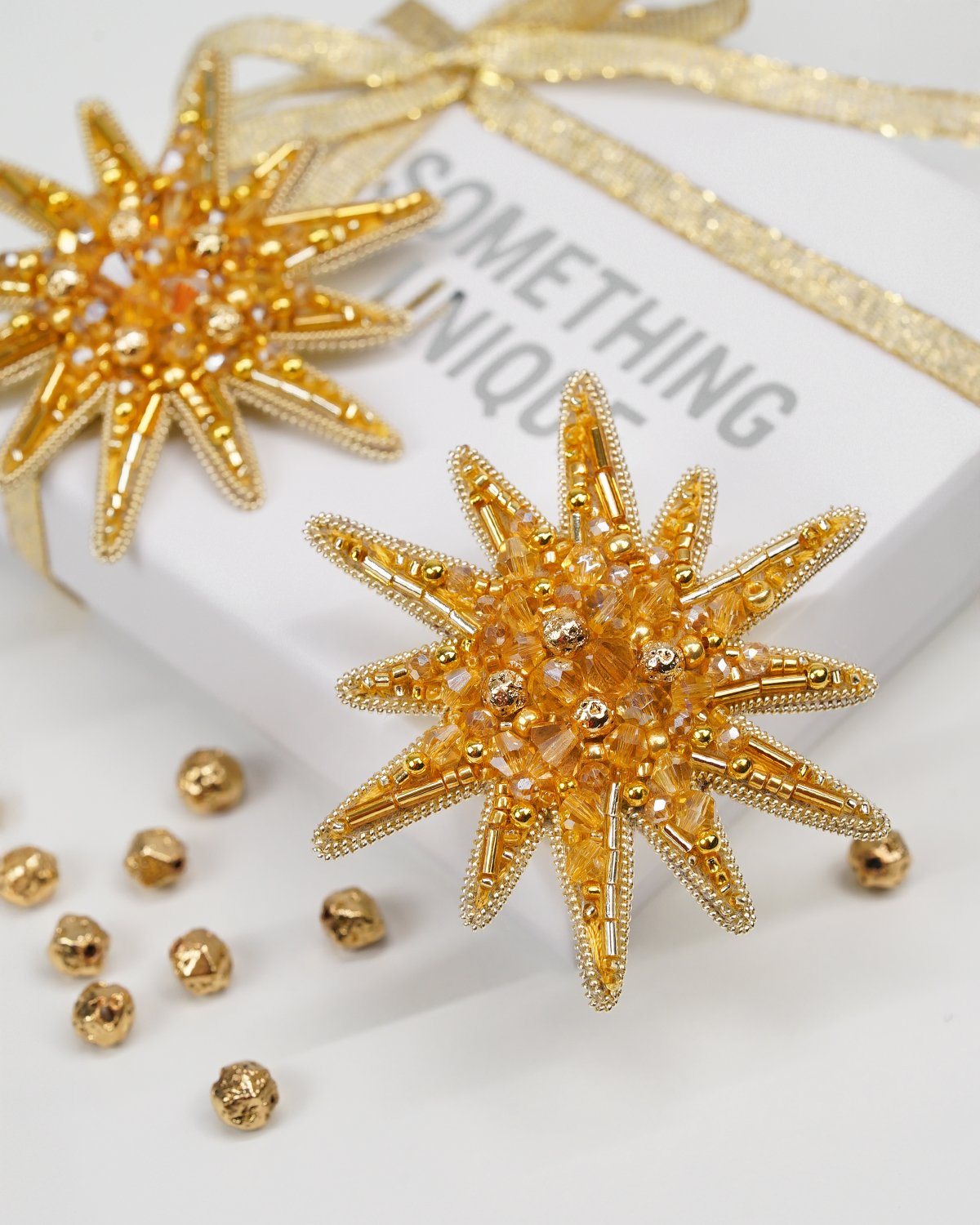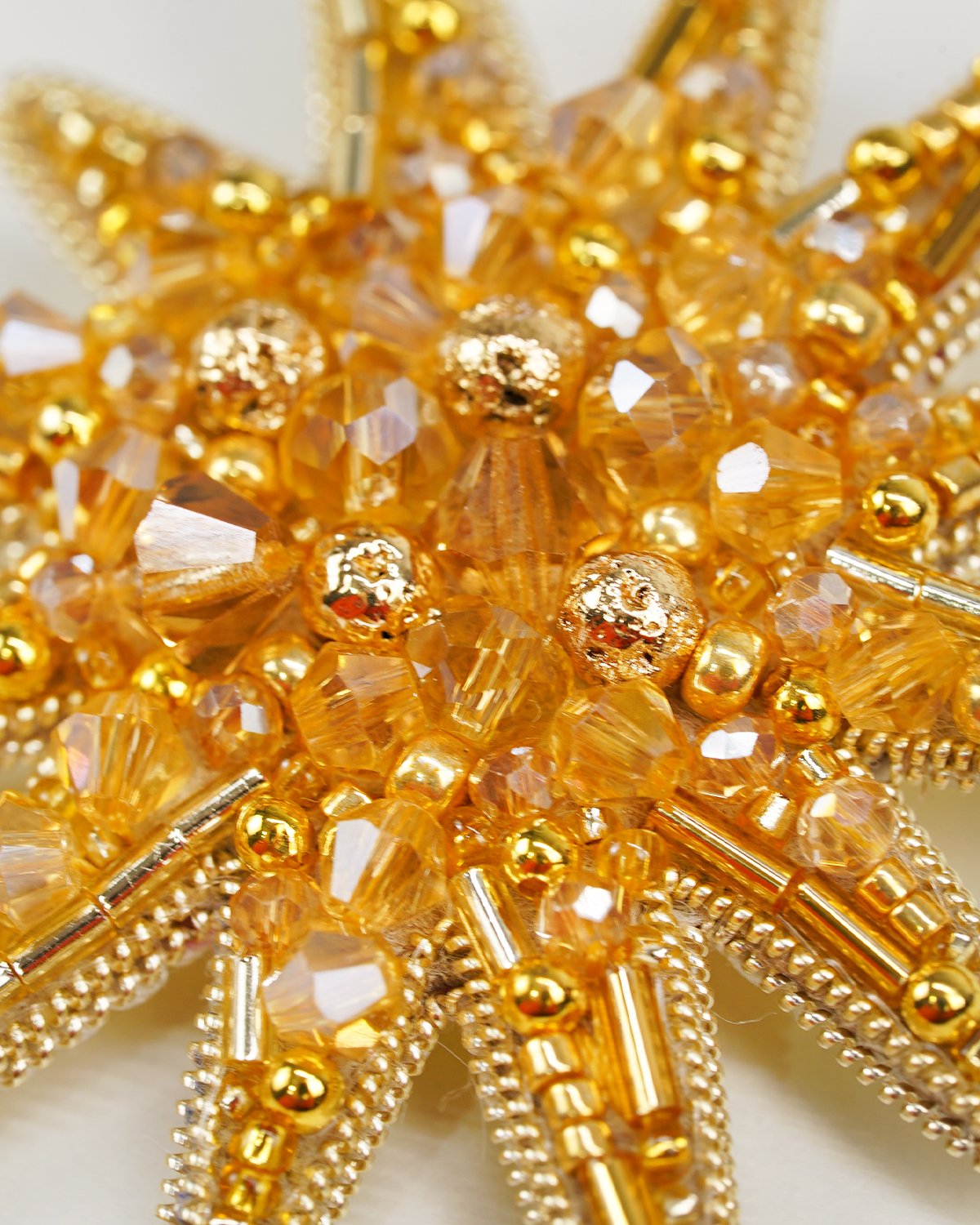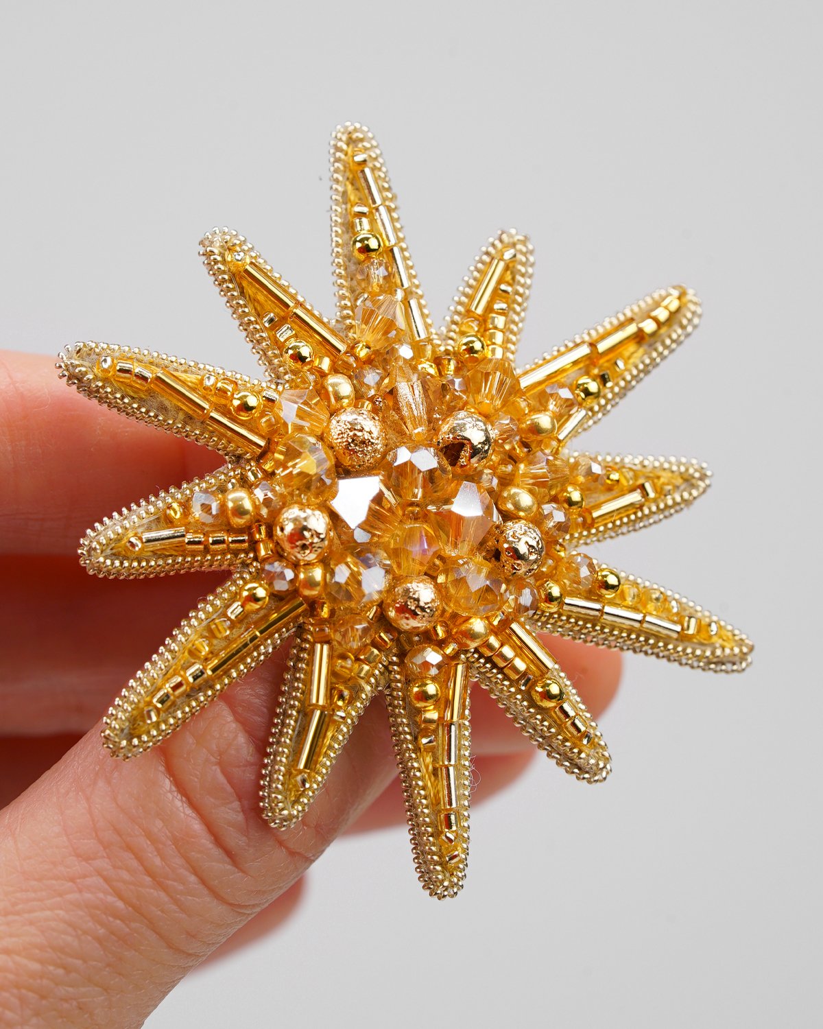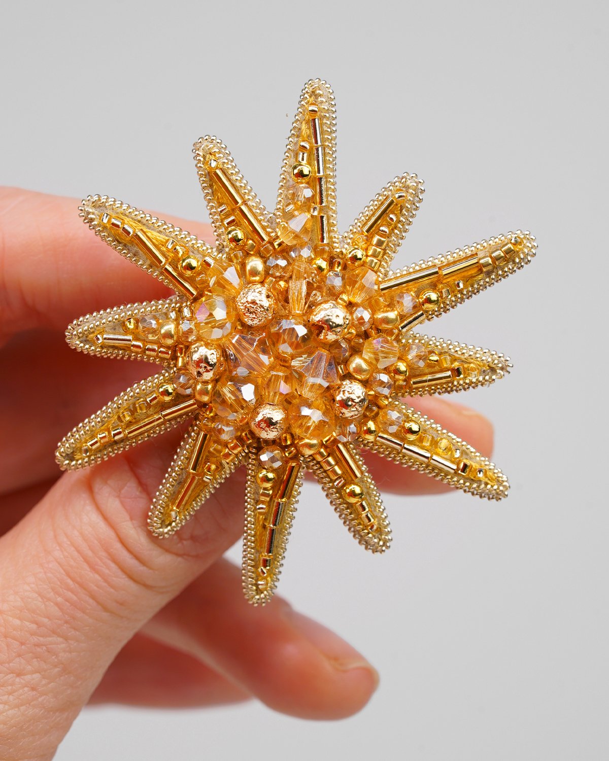 A handcrafted Gold Beaded Sun Brooch featuring a symbolic 12-ray star representing harmony and wholeness. Made with Swarovski crystal beads, faceted glass beads, and metal elements, this radiant piece shines like a real sun and adds warmth and meaning to any outfit.