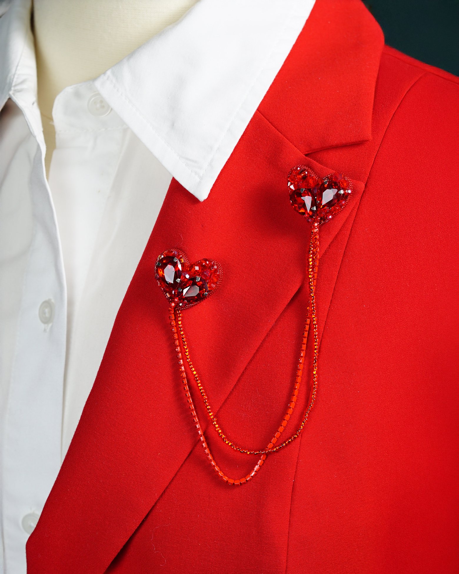 Make a stunning statement with this exquisite handmade beaded collar brooch featuring two connected hearts. The piece showcases dazzling red rhinestone chains and crystal beads that catch and reflect light beautifully. The hearts are intricately crafted with faceted crystals set in a detailed border, creating a romantic and eye-catching design. The dual heart motif is joined by elegant strands of red beading that drape gracefully, adding movement and sophistication to any outfit. Perfect for special occasions, this versatile accessory can transform both casual and formal attire. The rich red color adds a bold pop of color while the sparkling elements create dimension and visual interest. This unique piece combines classic romantic symbolism with contemporary styling, making it an ideal accessory for fashion-forward individuals who appreciate handcrafted details.