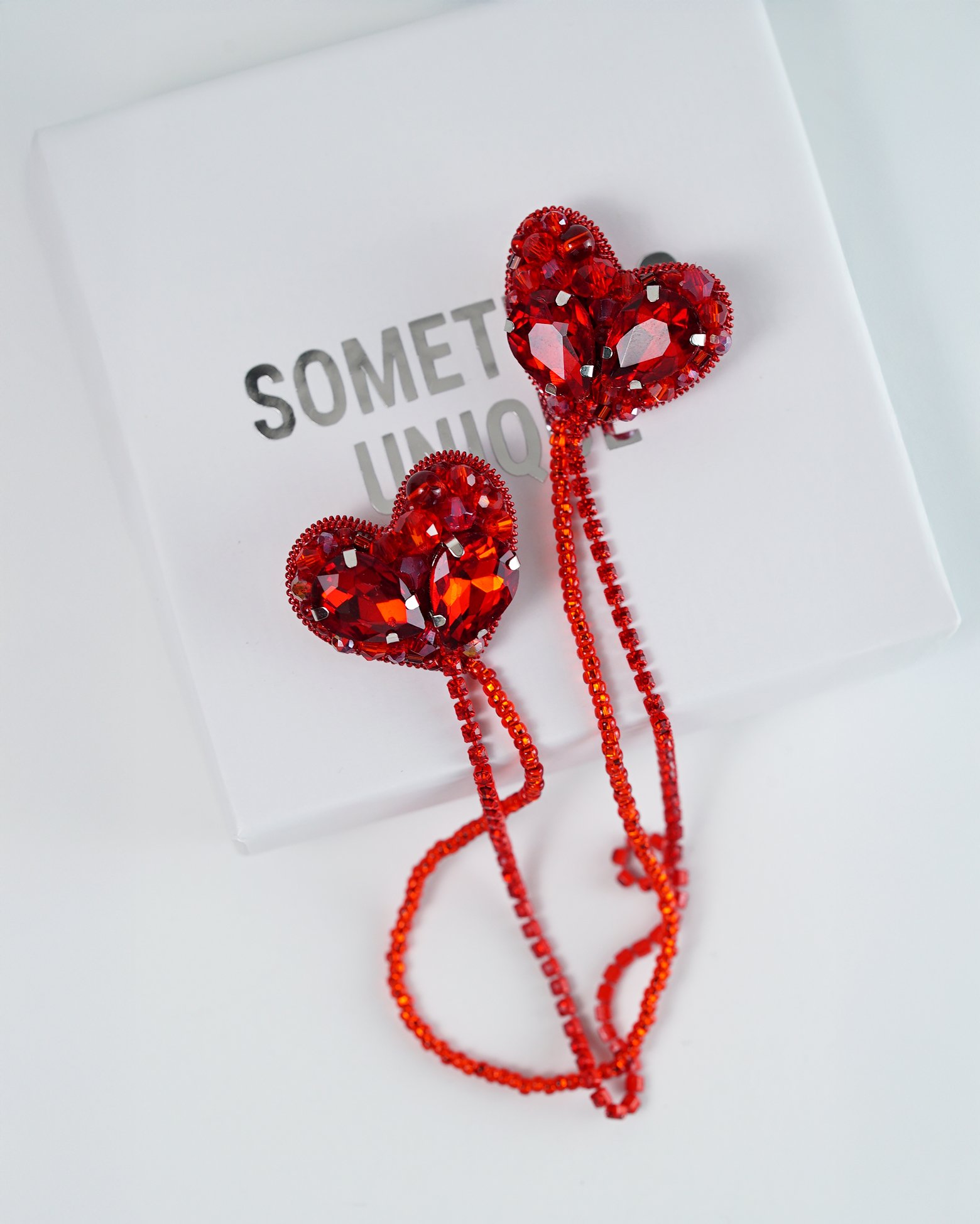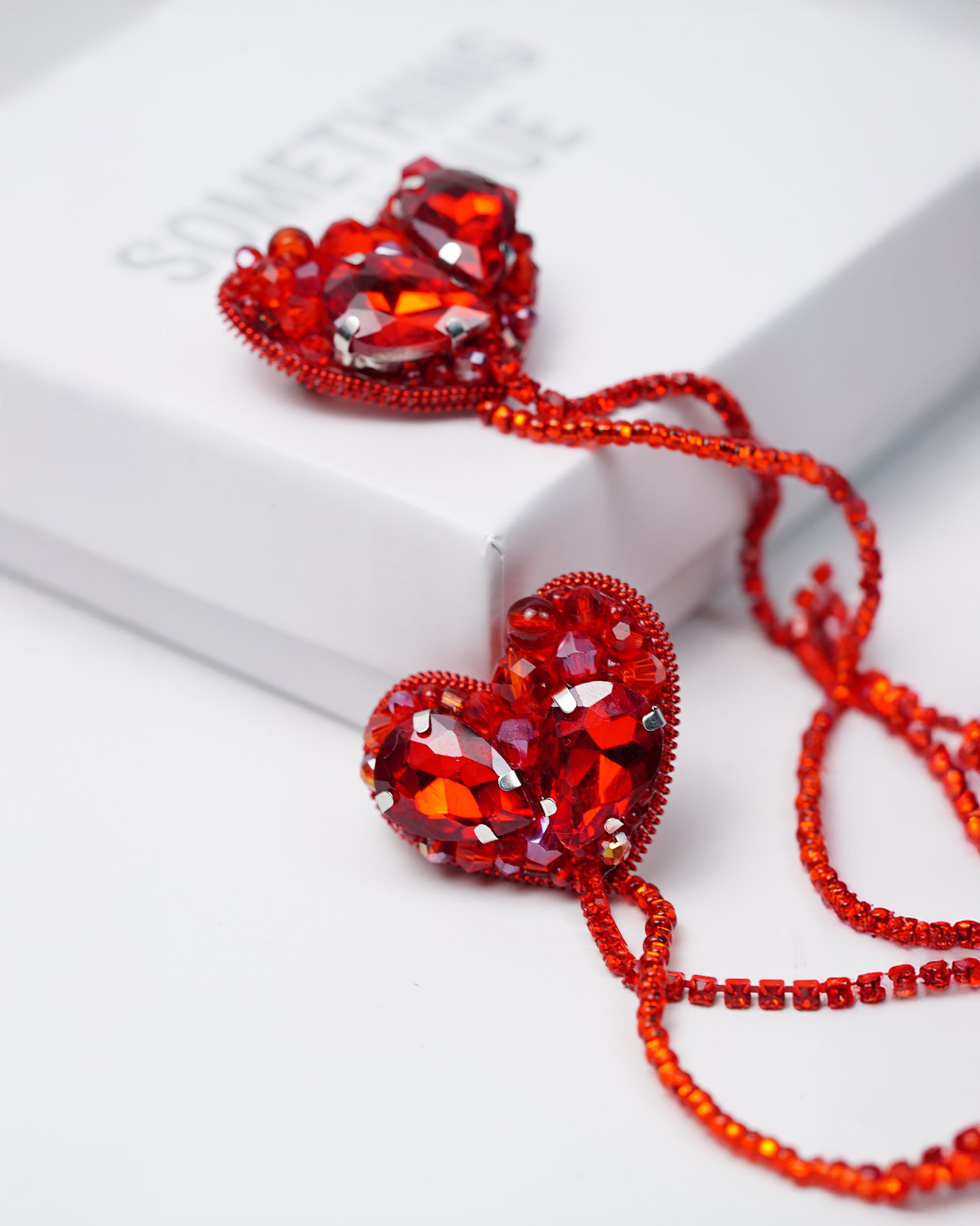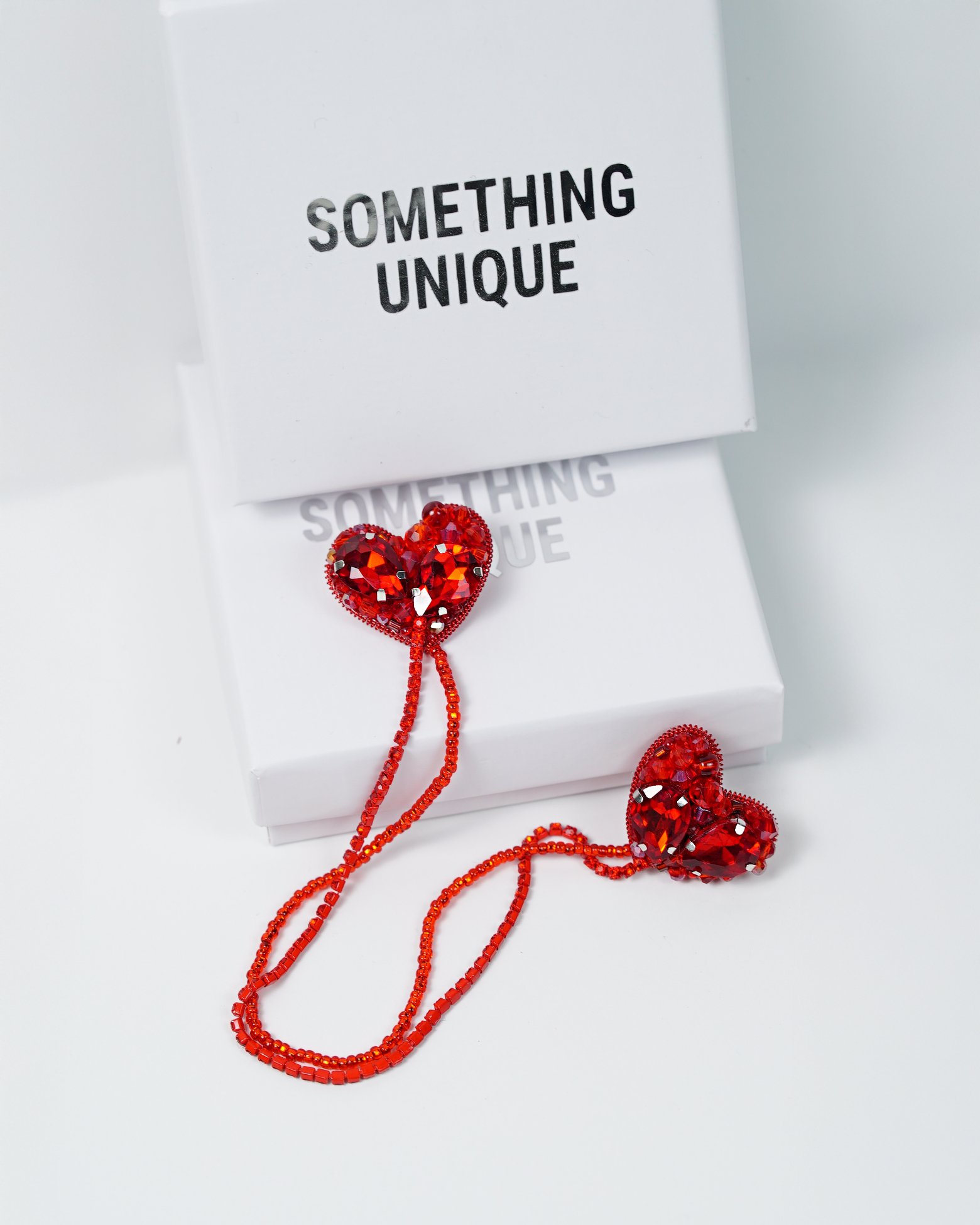 DESIGN FEATURES: Elegant double heart design with sparkling red rhinestones and crystal beads, creating a stunning visual effect