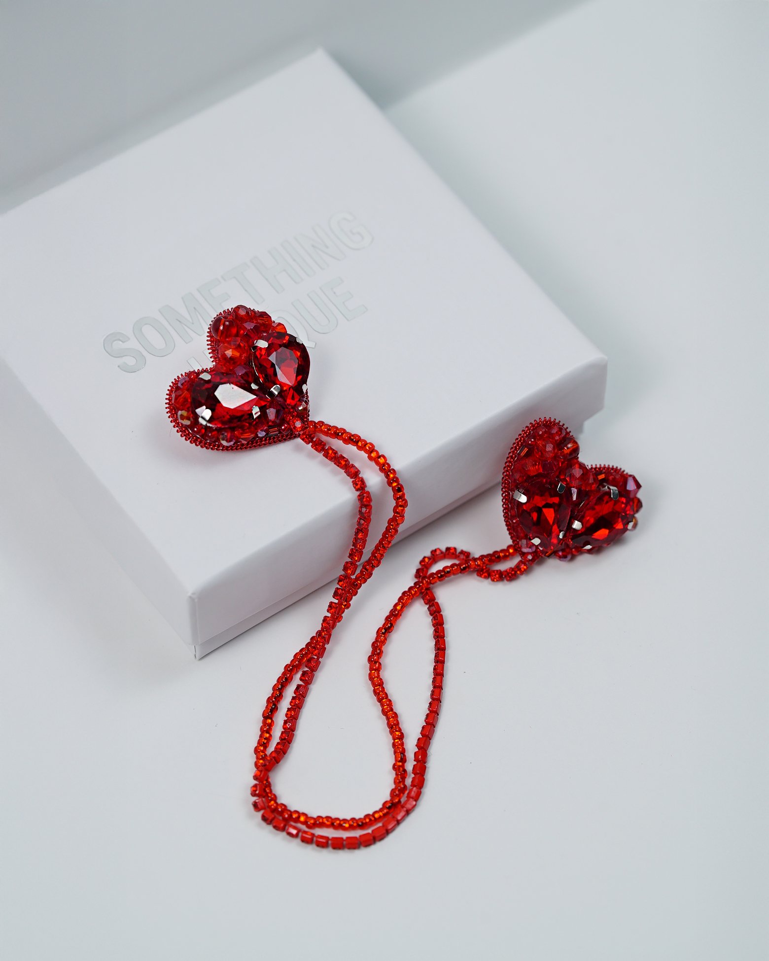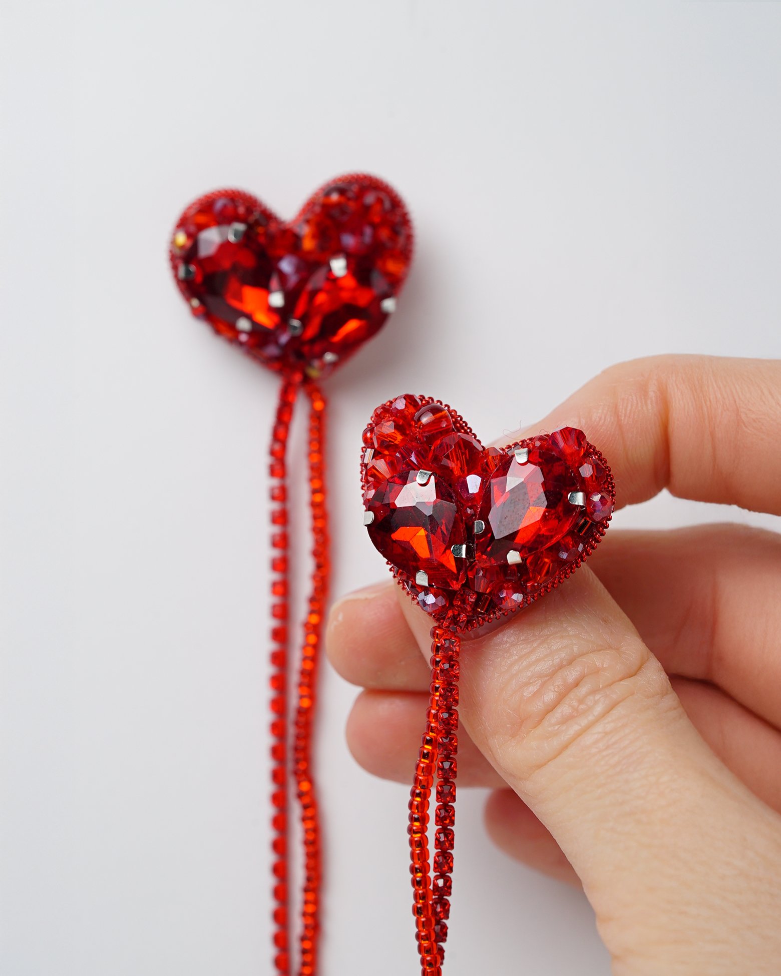 DIMENSIONS: Two heart-shaped elements connected by decorative red beaded chains, perfect for collar embellishment